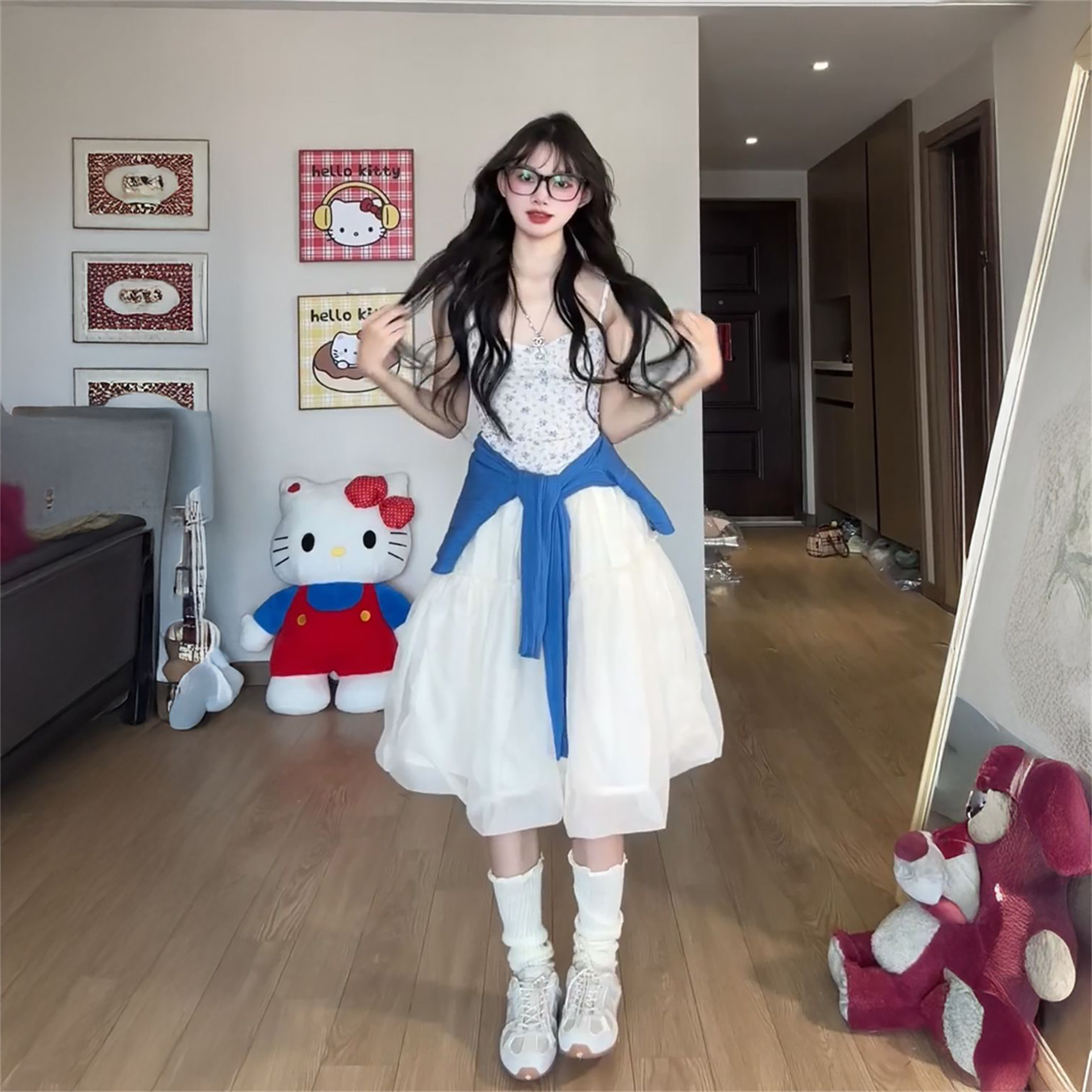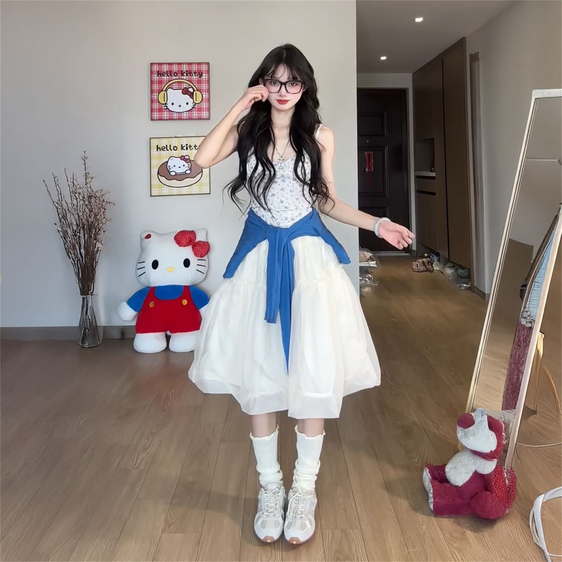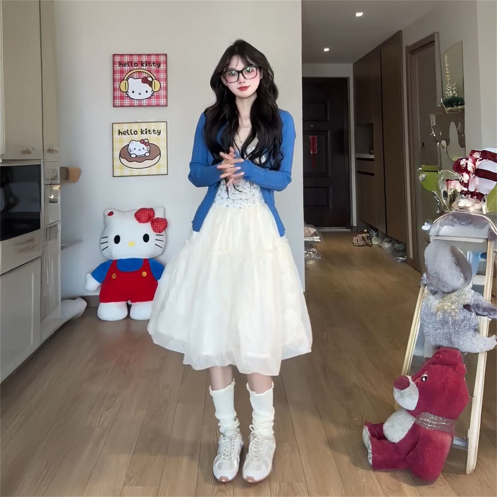 2026新款温柔气质风蓝色针织开衫+碎花吊带+杏色花苞长裙三件套装