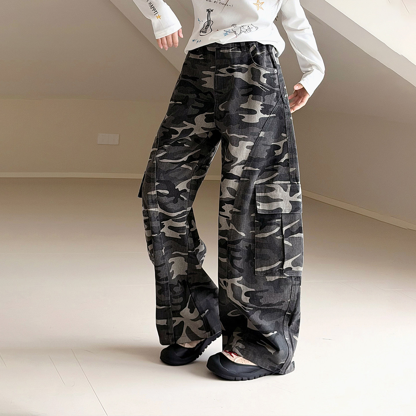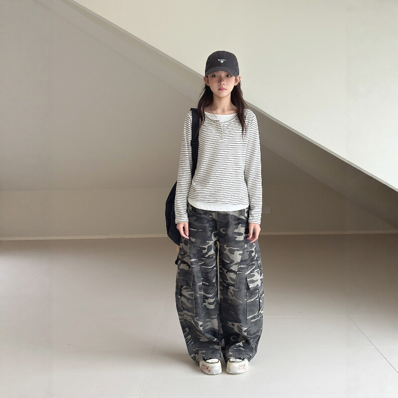 【迷彩】初中生女牛仔工装裤2026春装新款青少年休闲弯刀裤长裤子