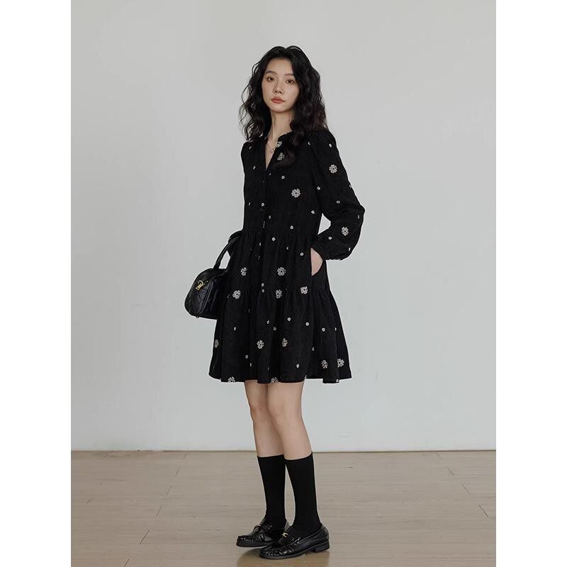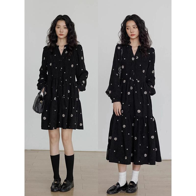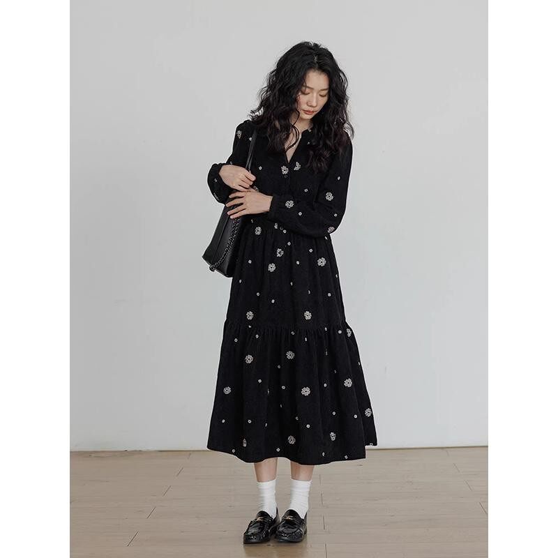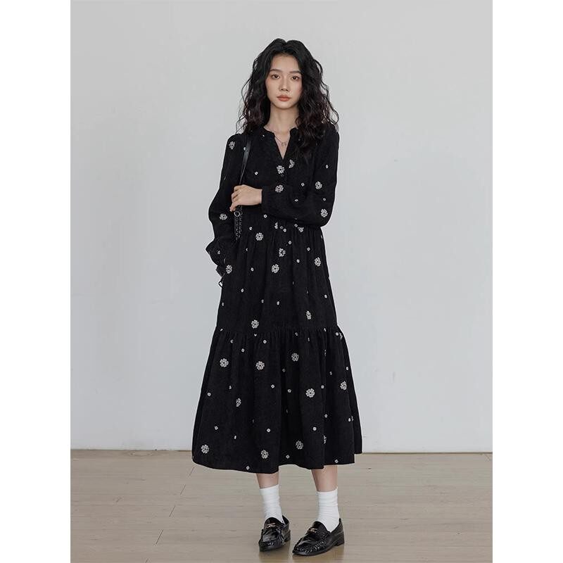 刺绣大码连衣裙女秋冬2025新款设计感v领长袖小个子气质中长裙