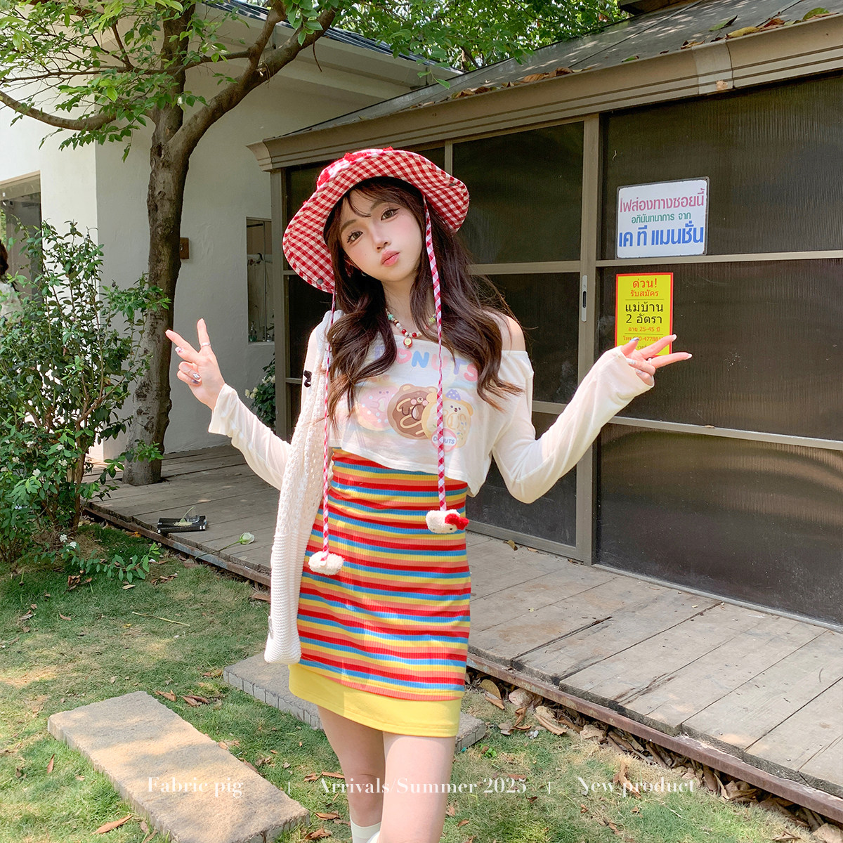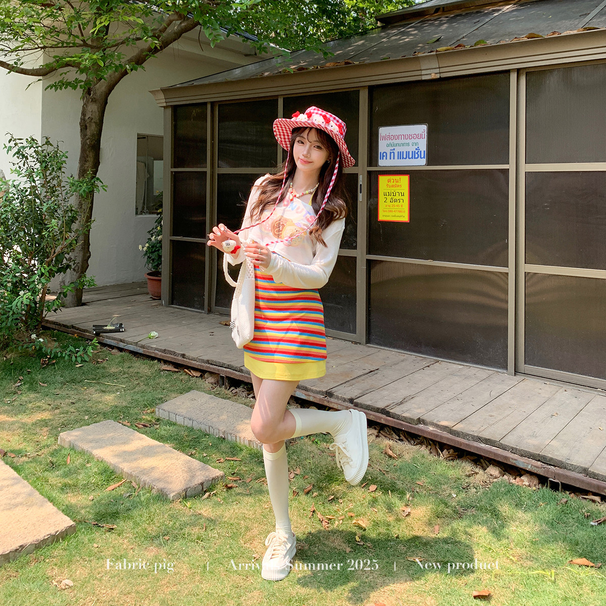 织物猪 彩虹甜心 夏日度假风挂脖连衣裙女多巴胺穿搭彩色条纹短裙