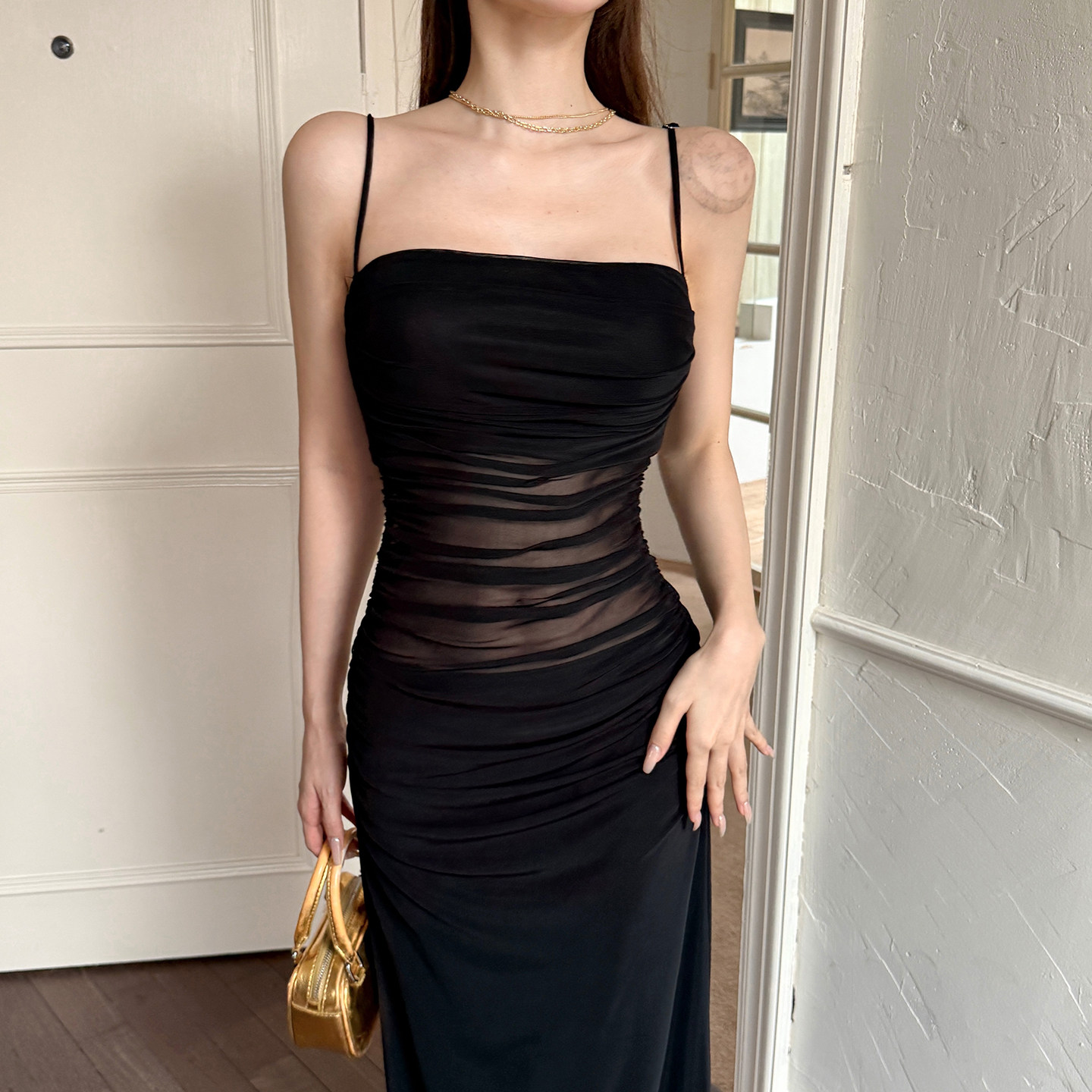 GirlsAt18 黑色网纱吊带连衣裙女夏季新款性感气质收腰包臀长裙