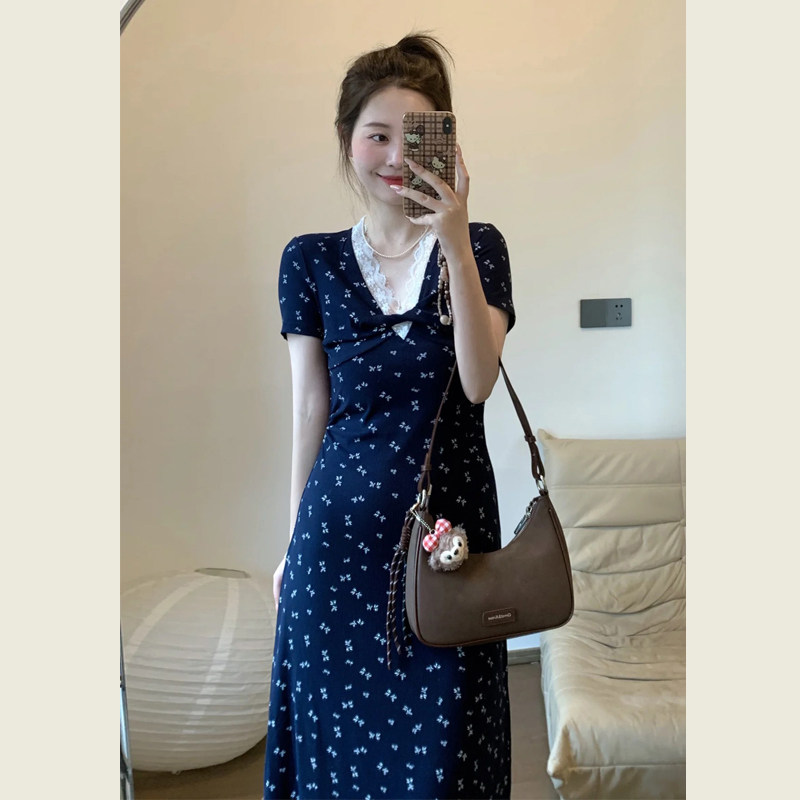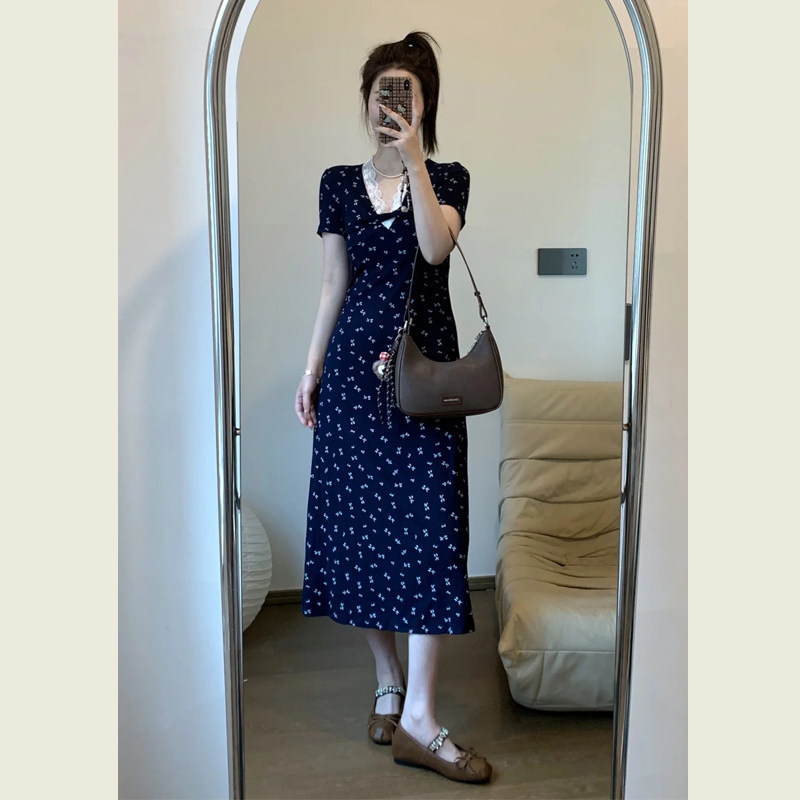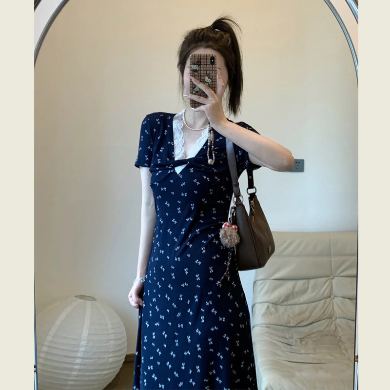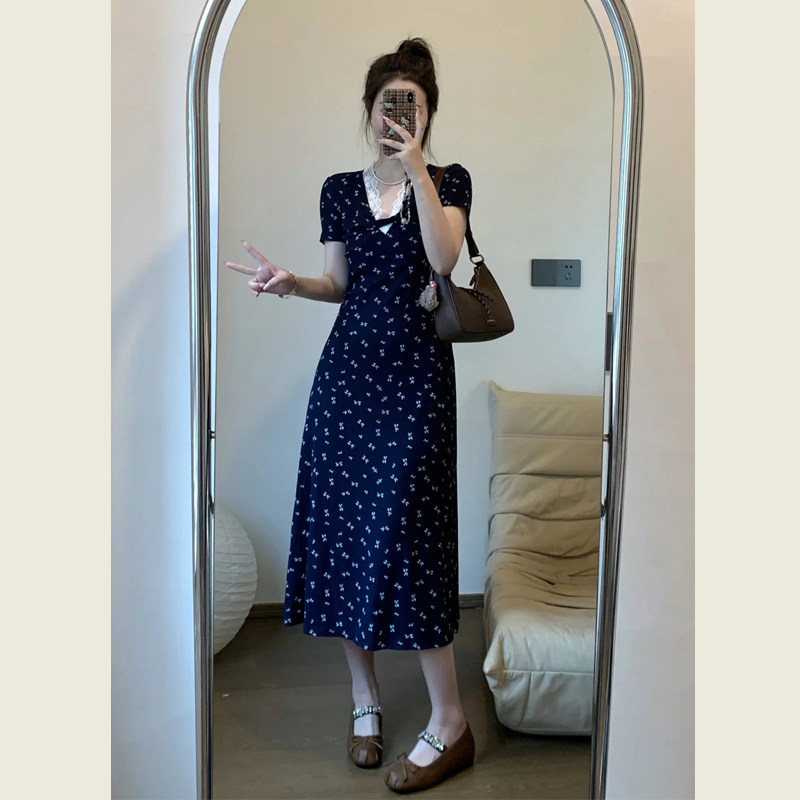 法式蕾丝花边V领碎花连衣裙女夏季新款高级感气质修身显瘦A字长裙