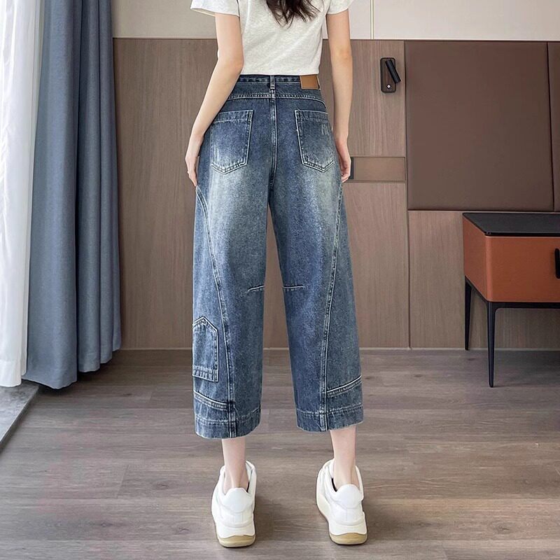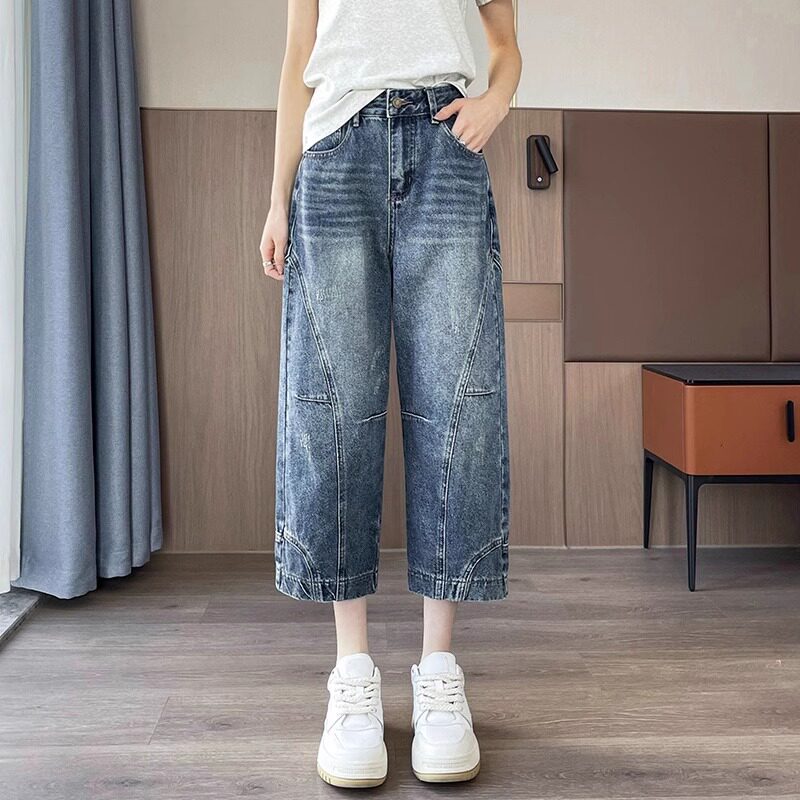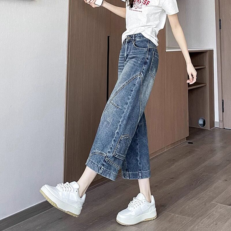 八分阔腿牛仔裤女2026新款夏季薄款美式拼接弯刀裤小个子九分裤子