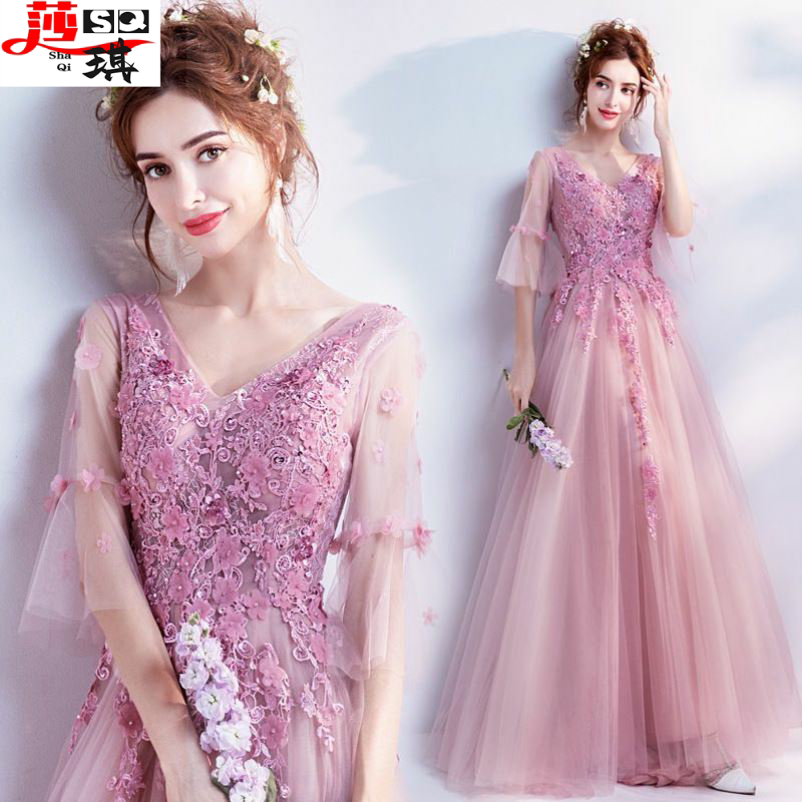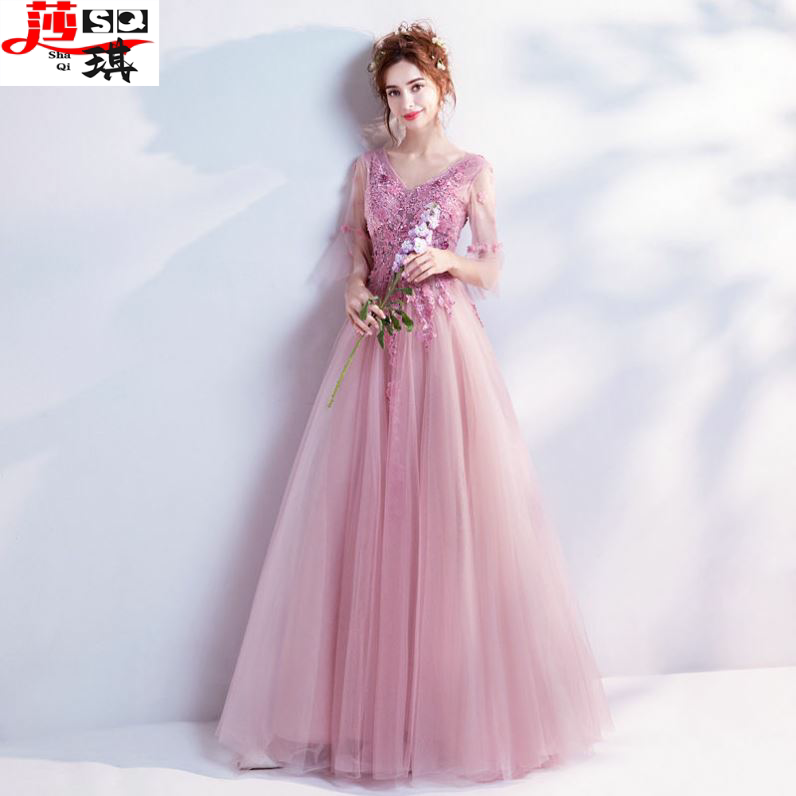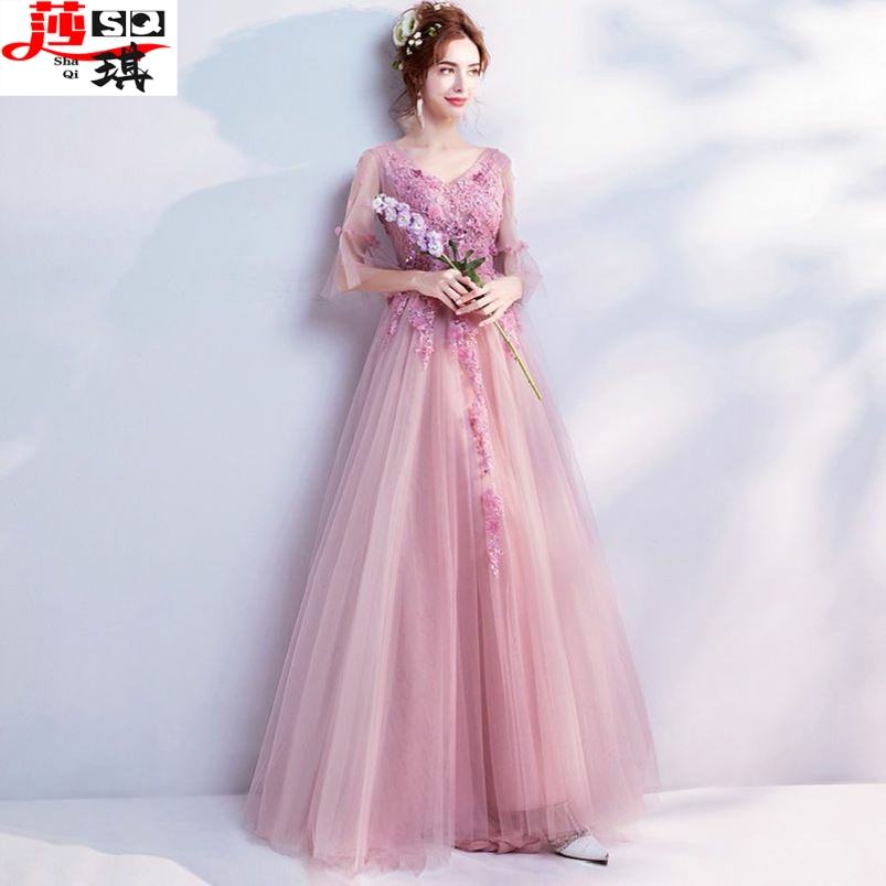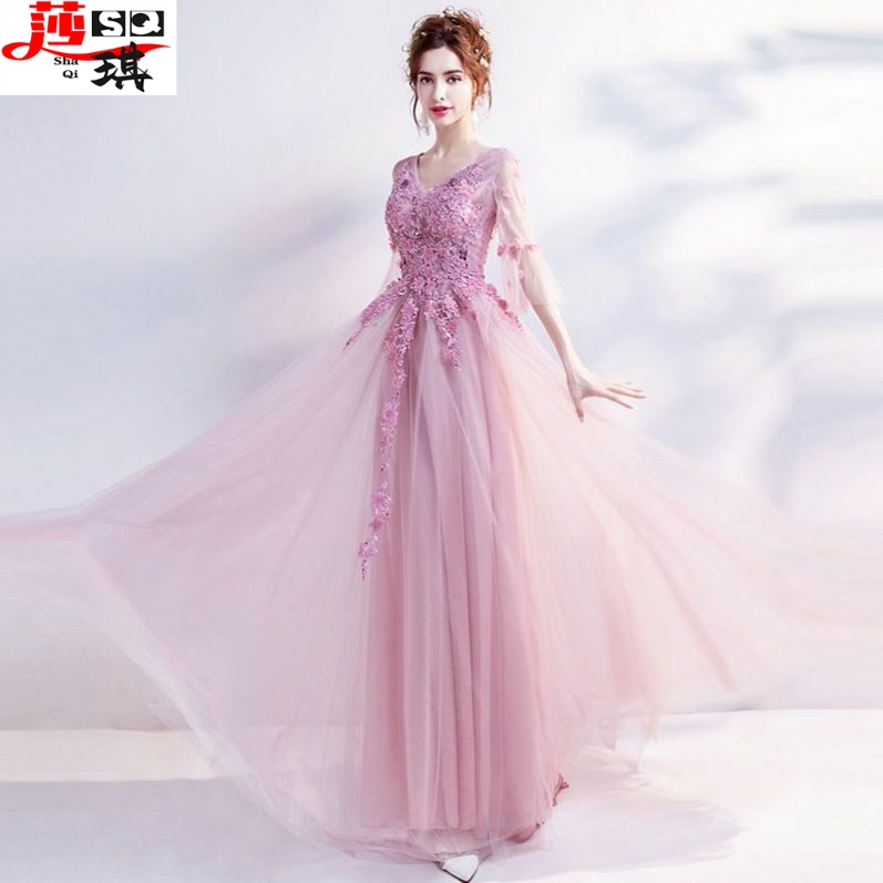 晚礼服粉色女2022新款气质长款伴娘服春冬季优雅生日年会连衣裙仙