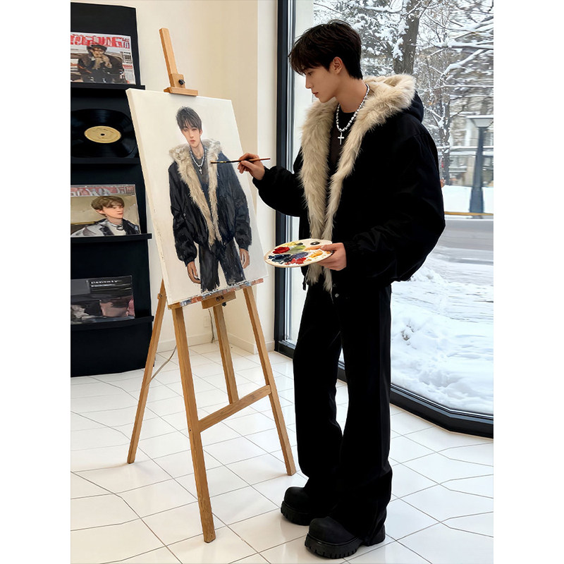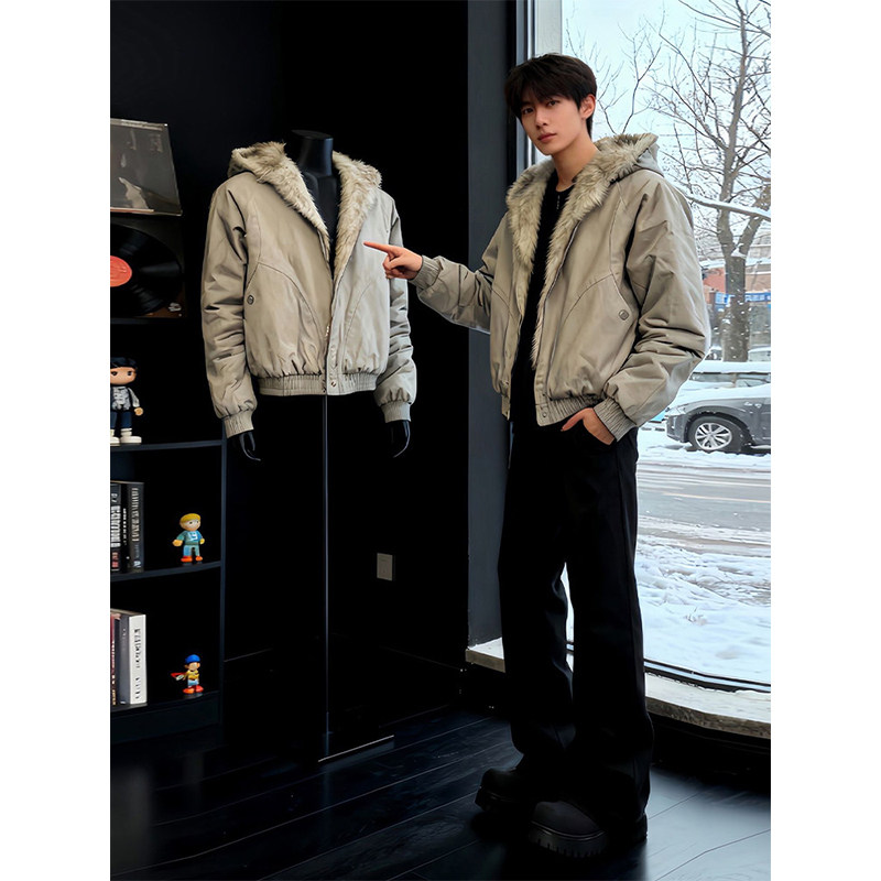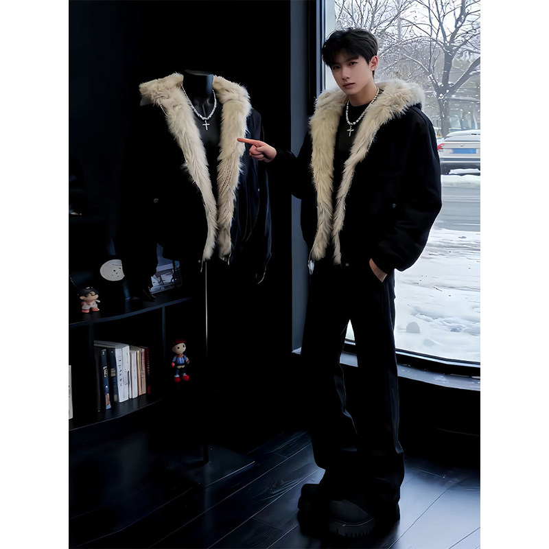 美式黑色座山雕棉衣男款冬季短款高级感痞帅毛领连帽棉服外套潮流