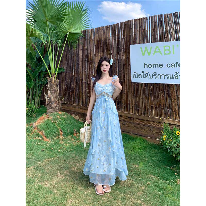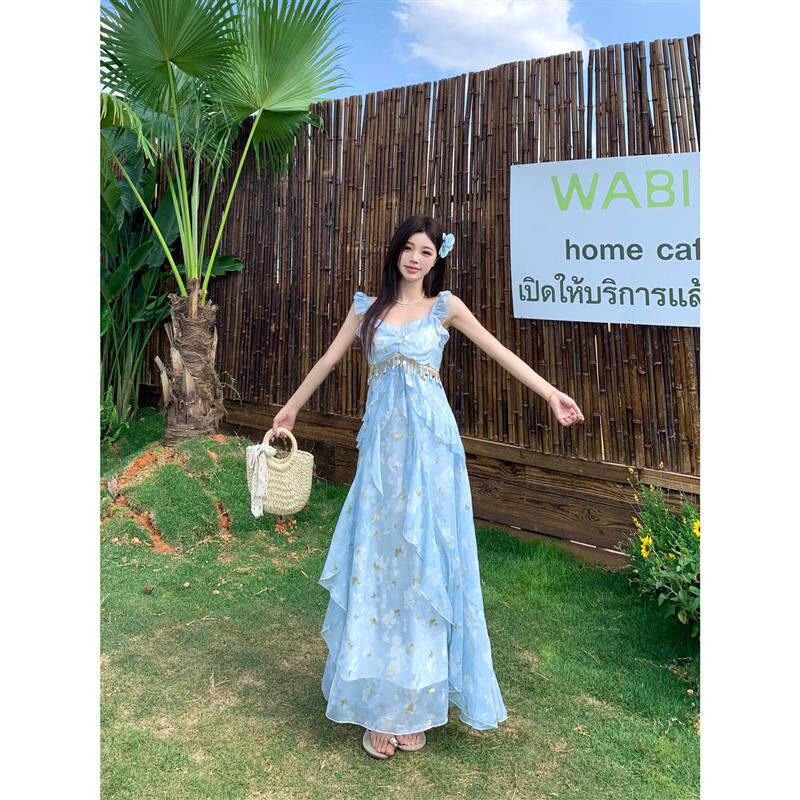 大码胖mm蝴蝶亮片吊带连衣裙女夏季荷叶边裙子外搭长袖开衫两件套