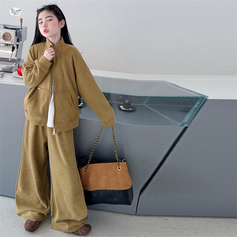 女童烫钻套装2026年春季新款慵懒风立领外套阔腿裤中大童休闲春装