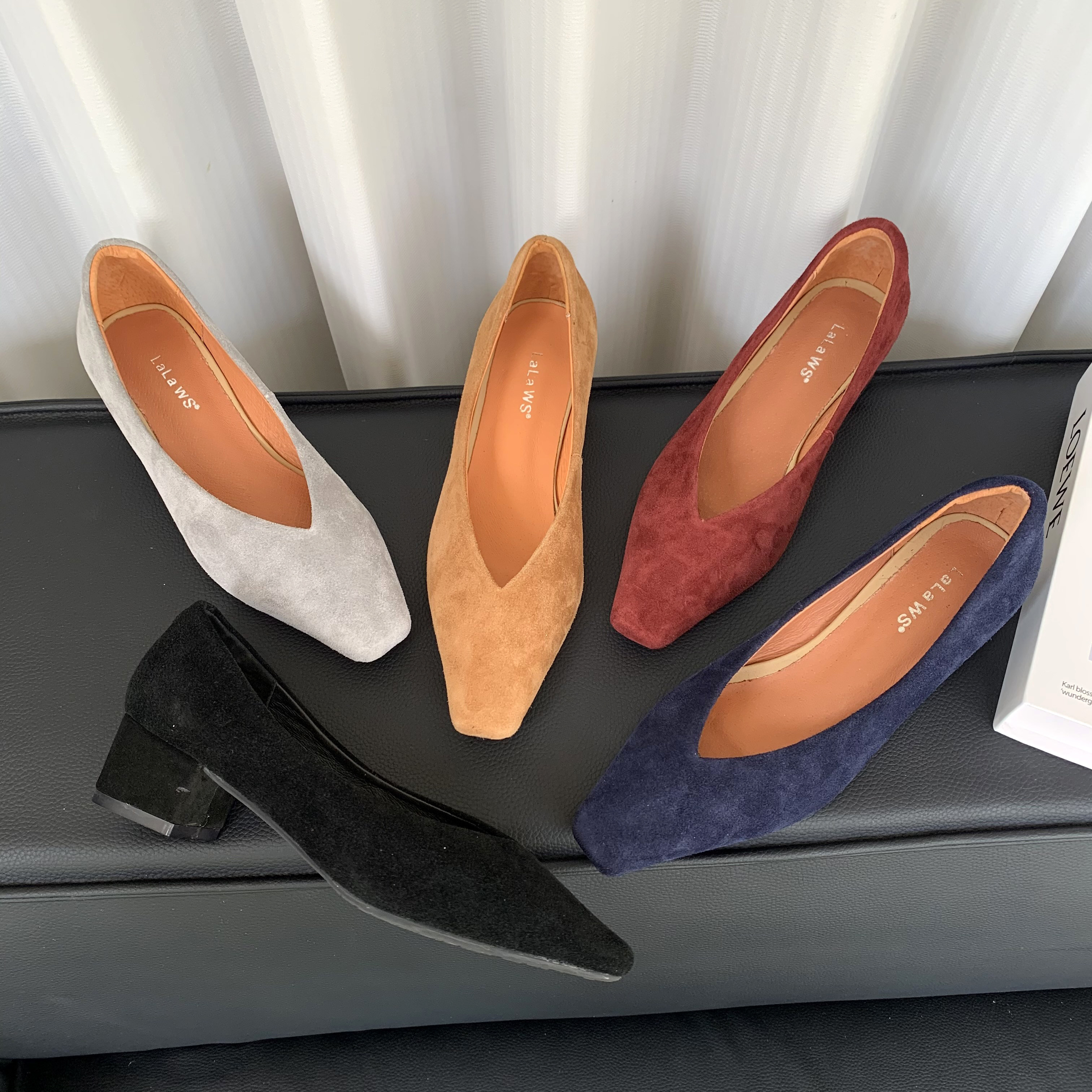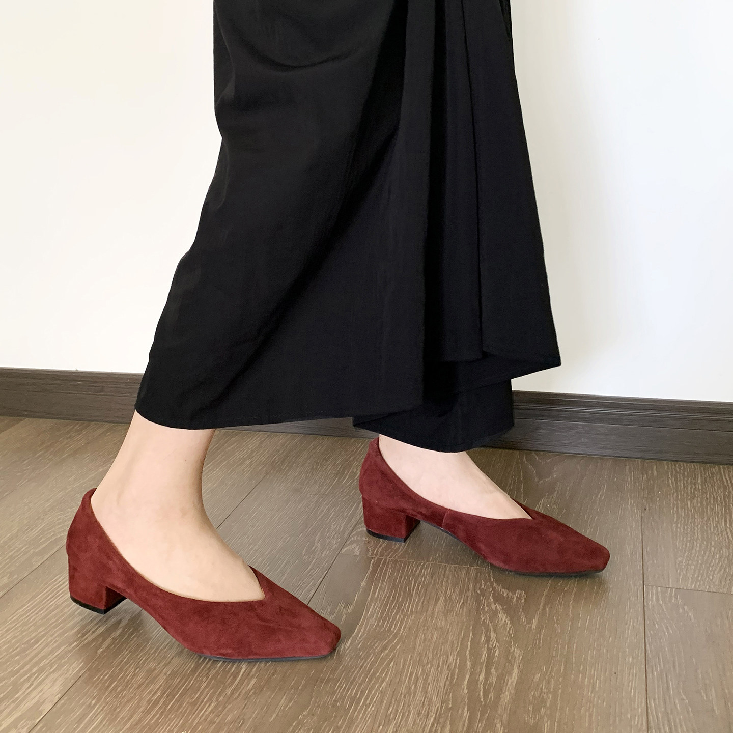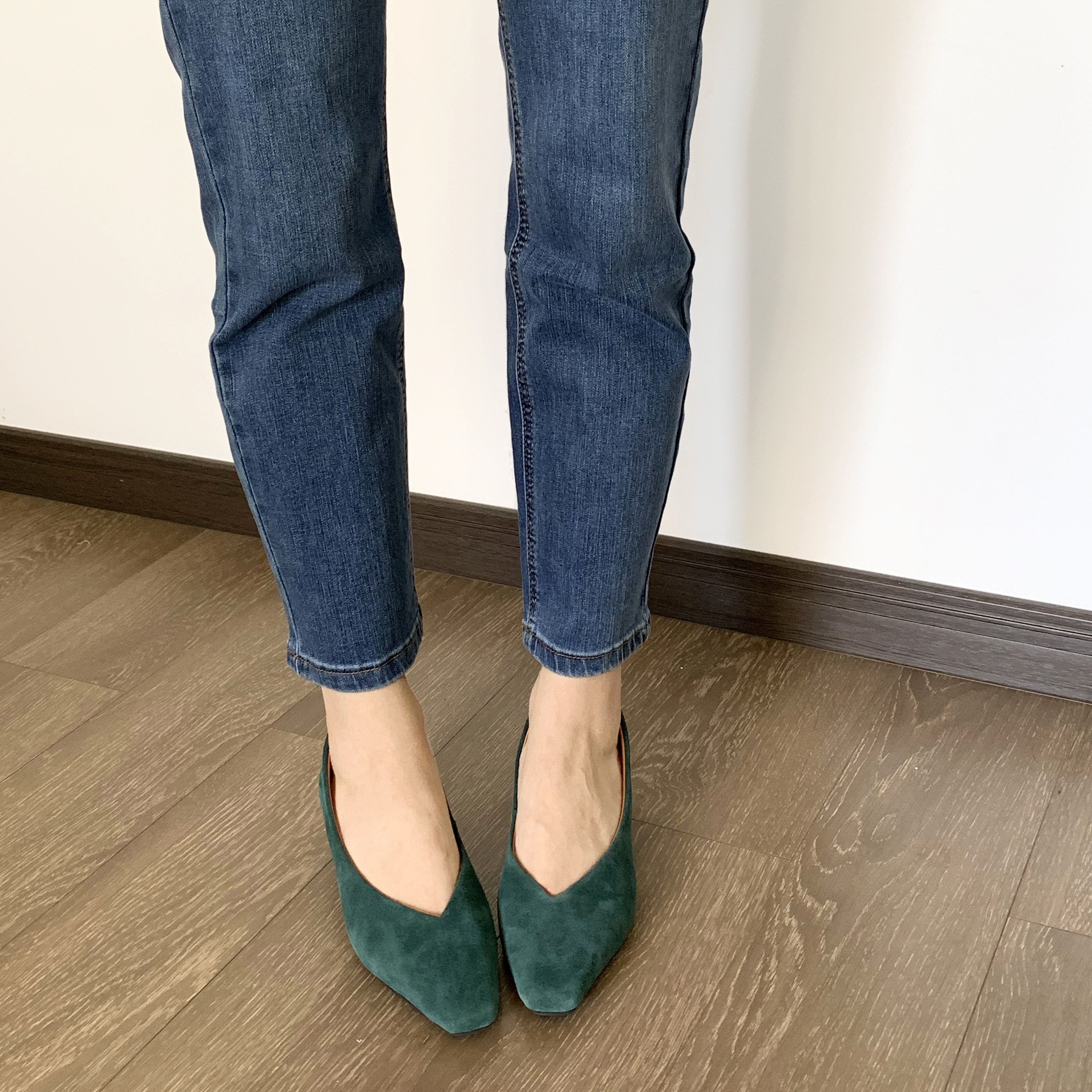 复古磨砂皮方头V口真皮单鞋女中跟粗跟通勤工作鞋舒适百搭奶奶鞋