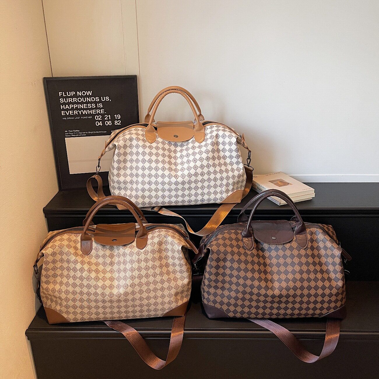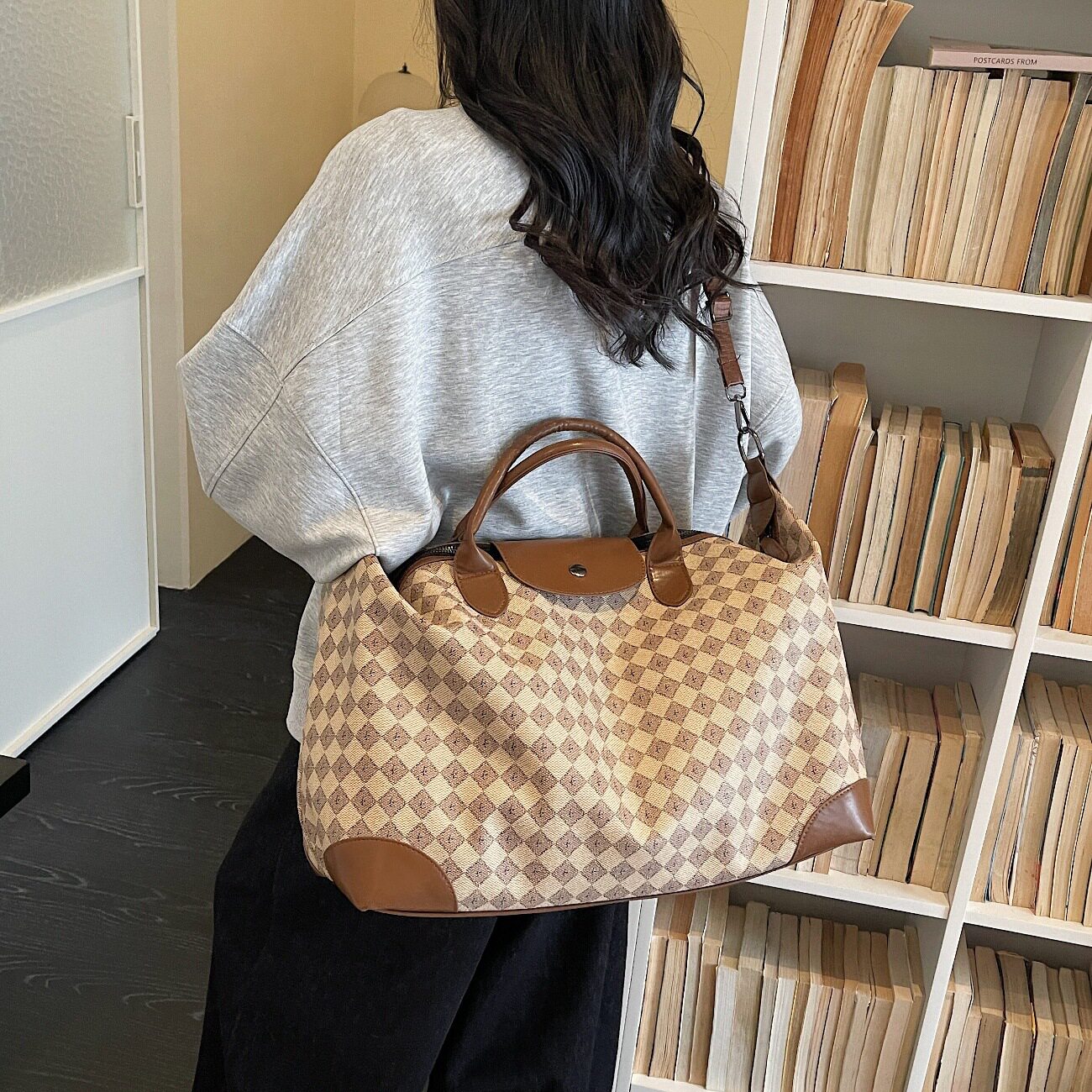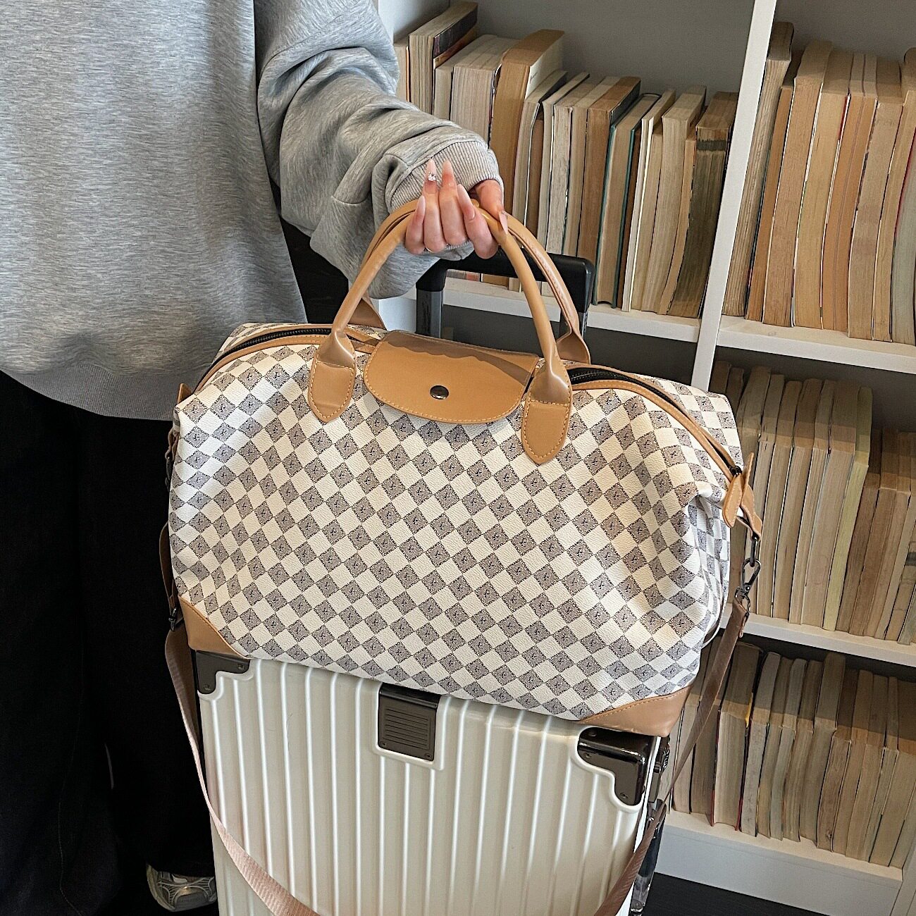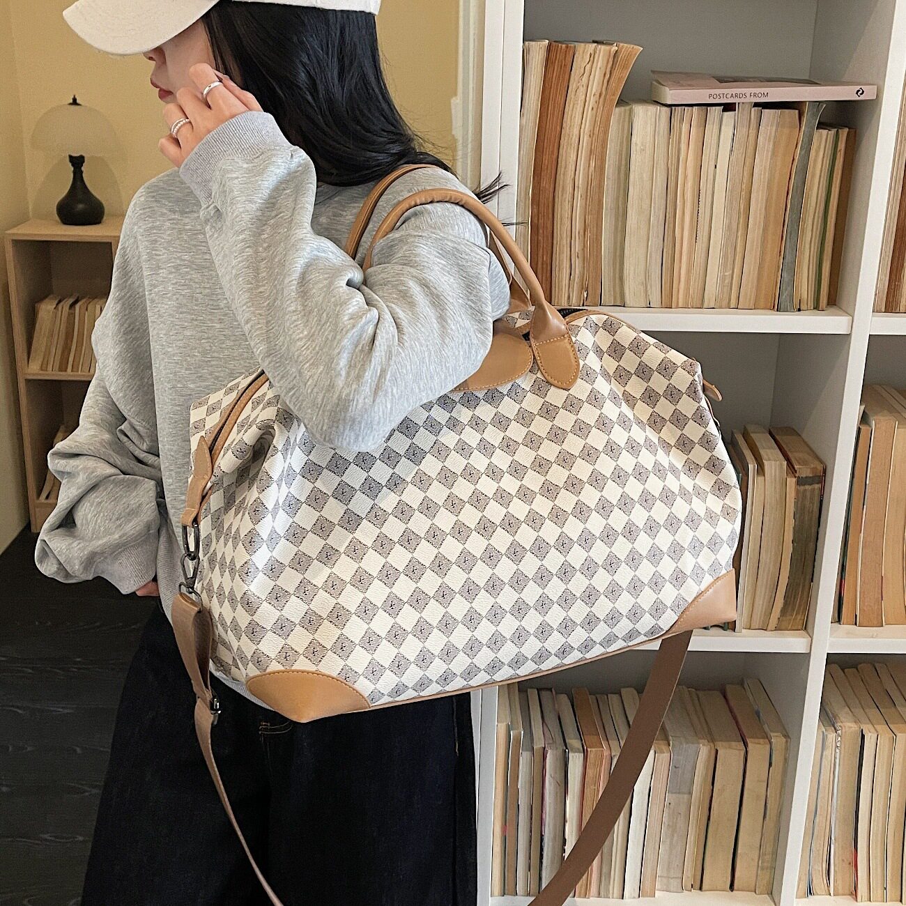时尚短途旅行包女2026春夏新款PU皮质高级感大容量格纹斜挎行李包