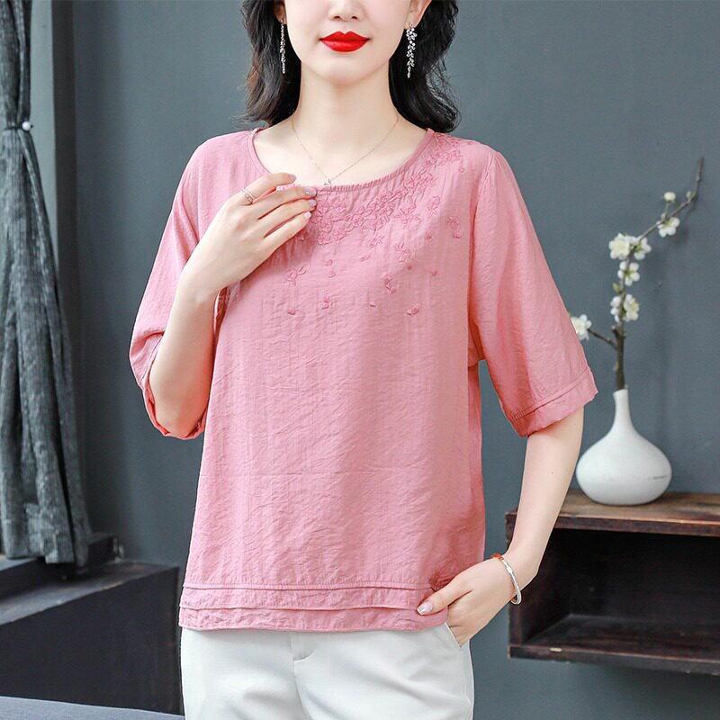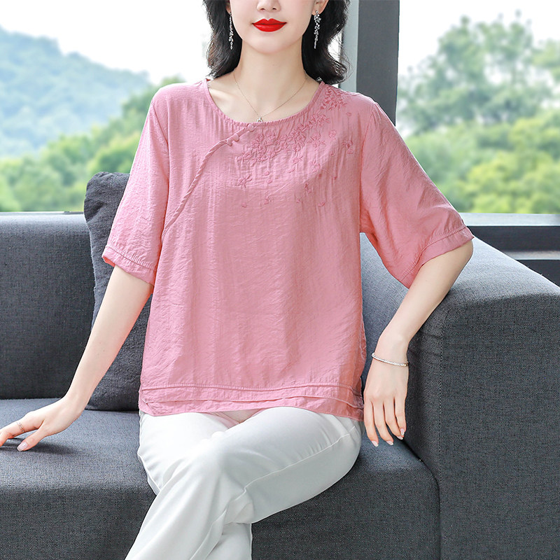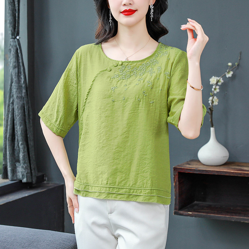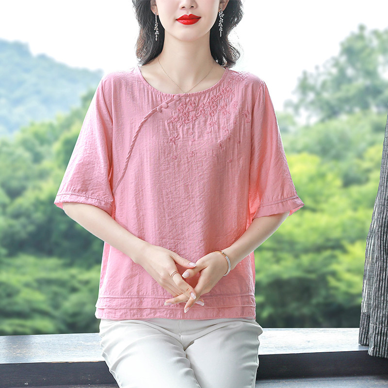短袖棉麻刺绣衬衫女2026年夏季新款斜襟盘扣套头拼接小衫亚麻上衣