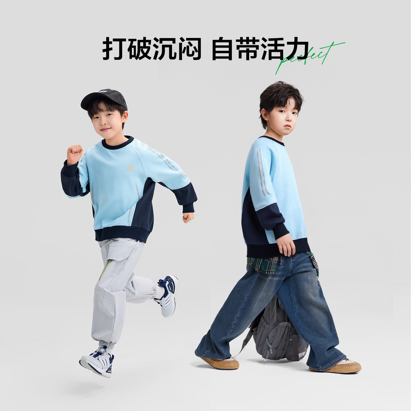 左西童装男童圆领卫衣春装大童上衣2026新款儿童运动反光条春秋款