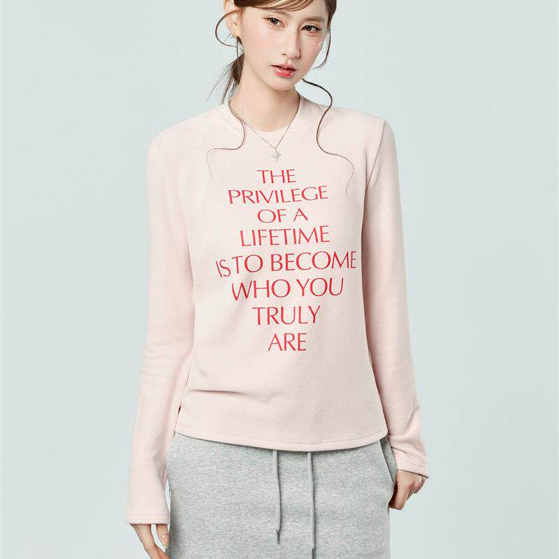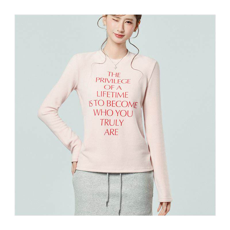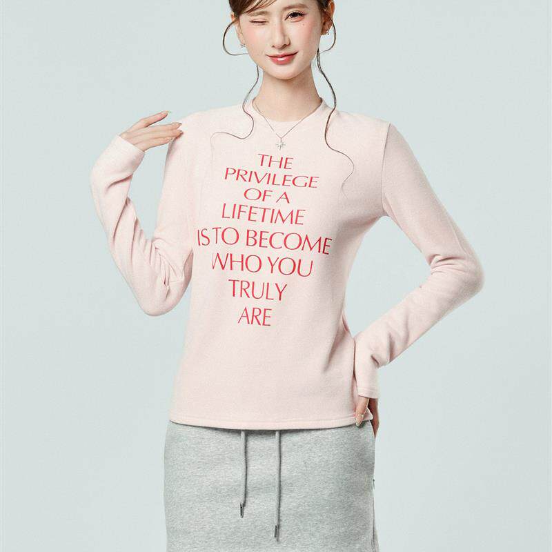 粉色圆领长袖T恤女可外穿秋冬季德绒加厚字母印花内搭打底衫上衣