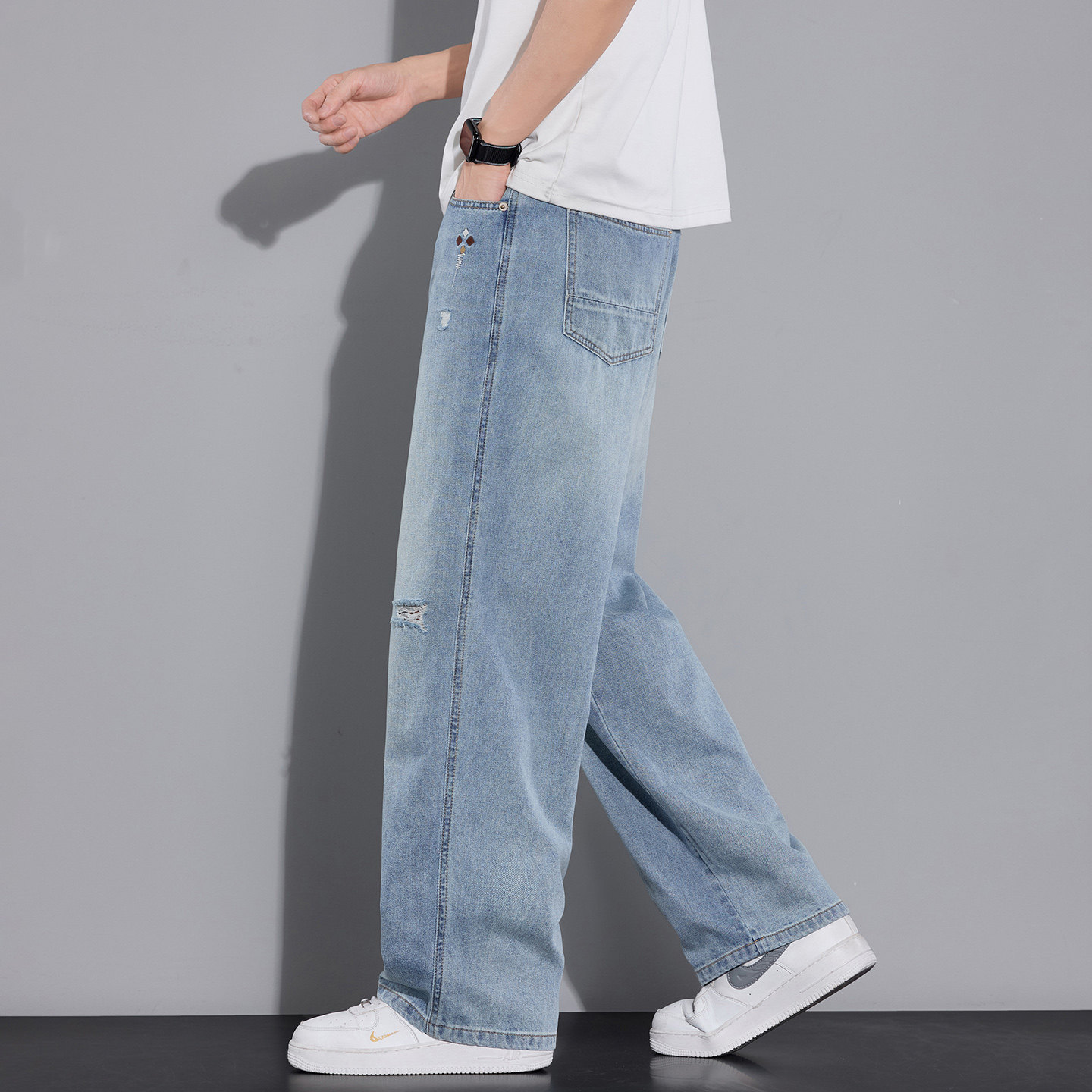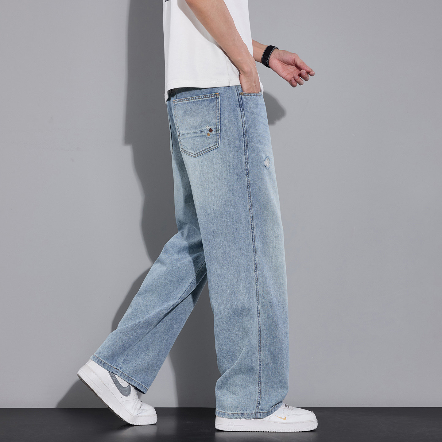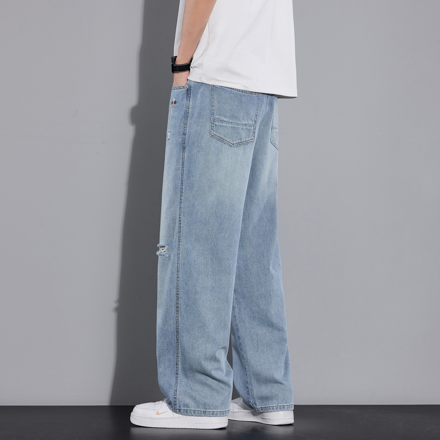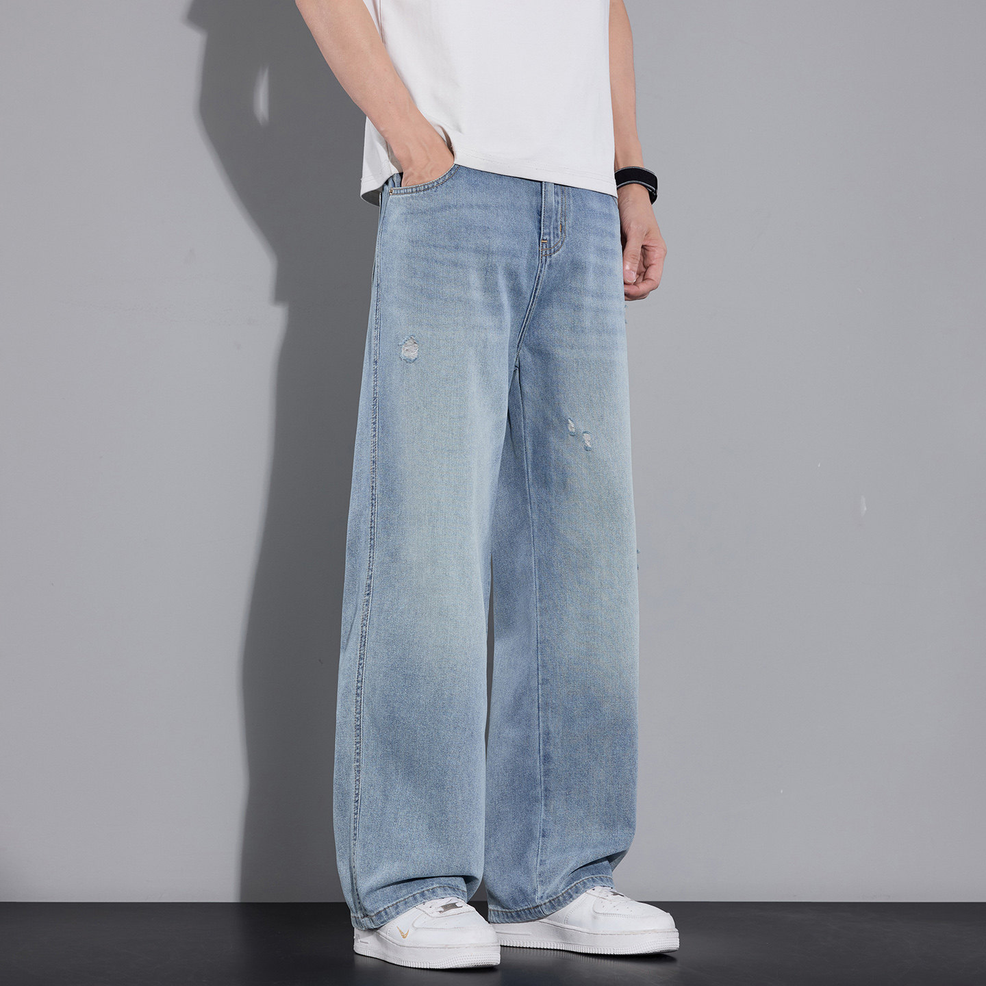 2026春夏新款浅蓝色宽松直筒破洞牛仔裤男士潮流百搭显瘦休闲长裤