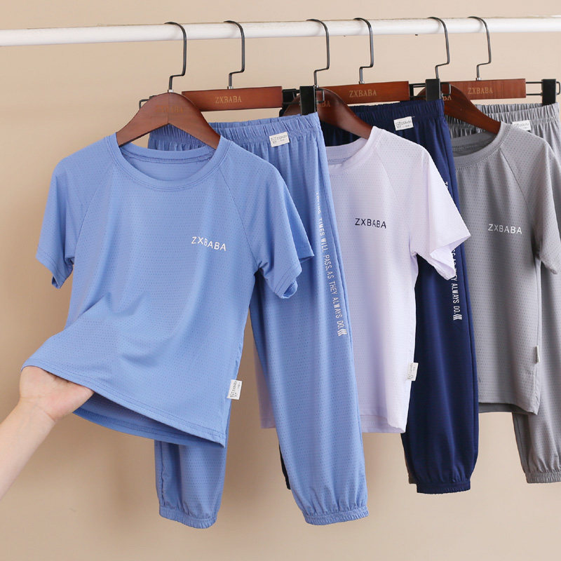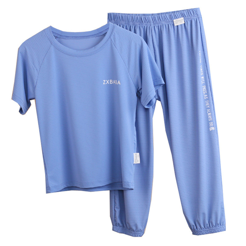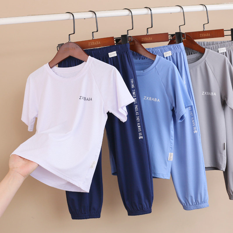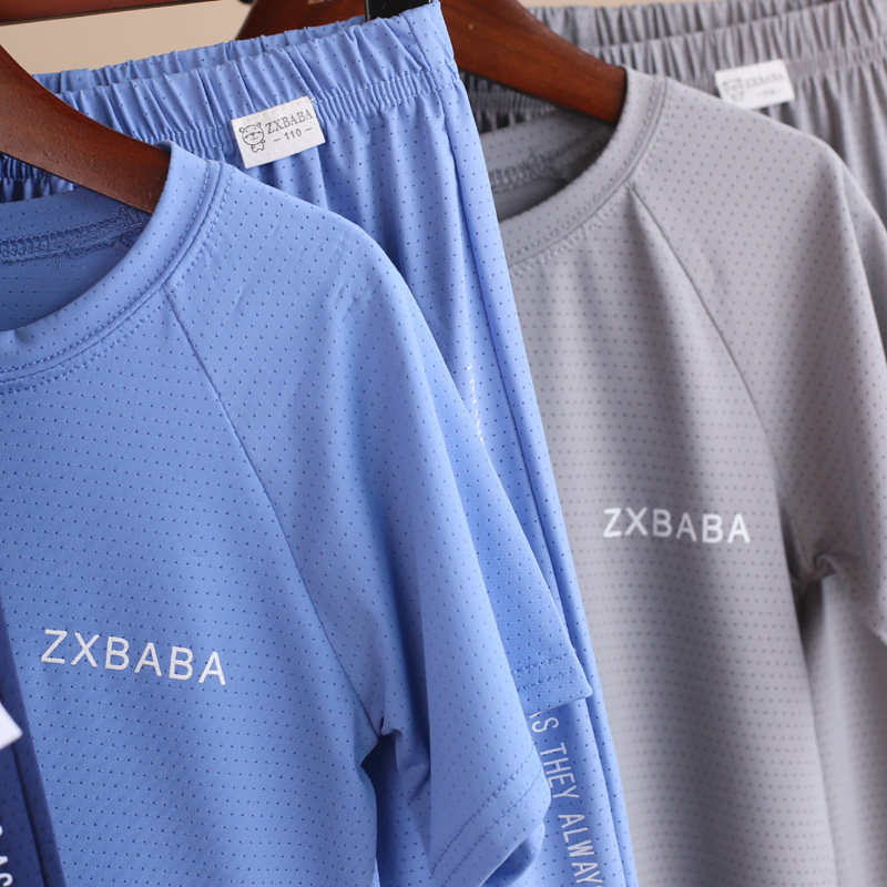 儿童冰丝速干薄短袖圆领衫长裤套装夏款男女童网眼半袖t恤灯笼裤