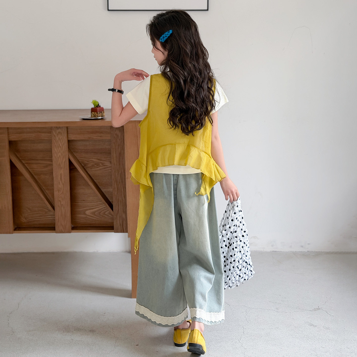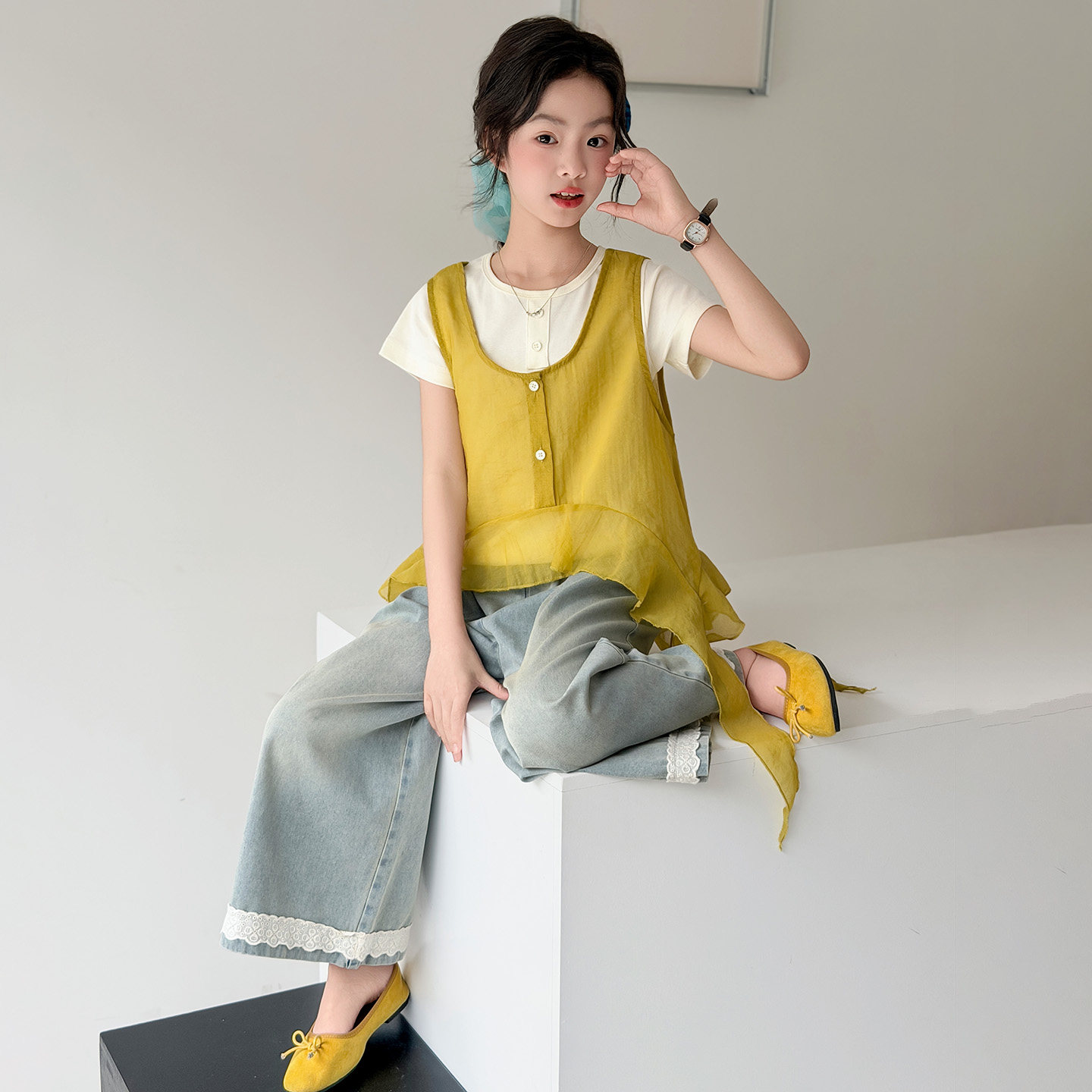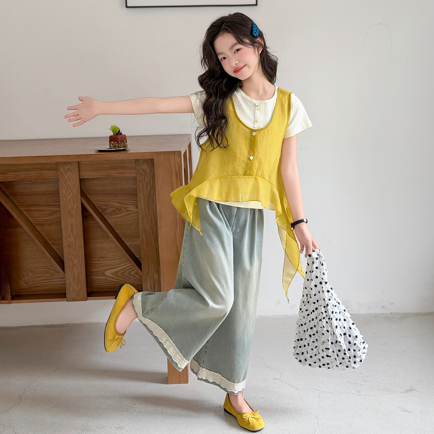 女童短袖T恤2026夏季中大童休闲上衣飘纱花边牛仔裤公主时尚套装
