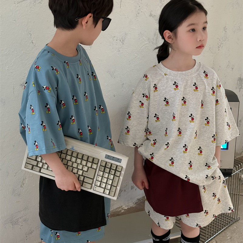 儿童满版卡通米奇印花T恤套装夏季新品韩系男女童短袖短裤两件套