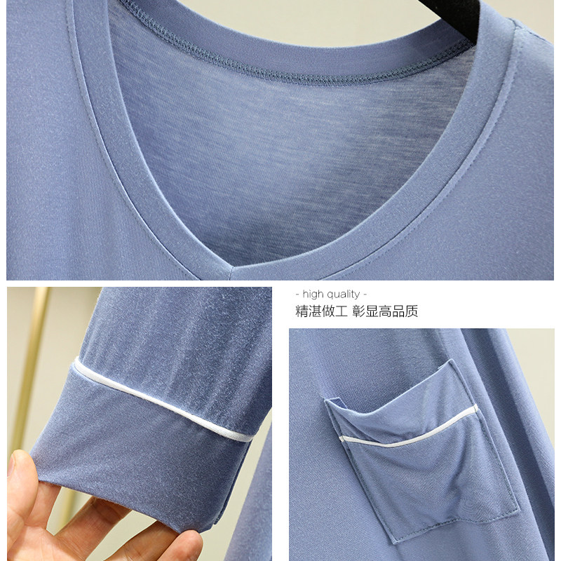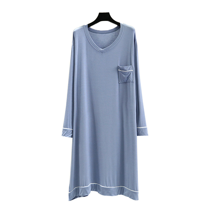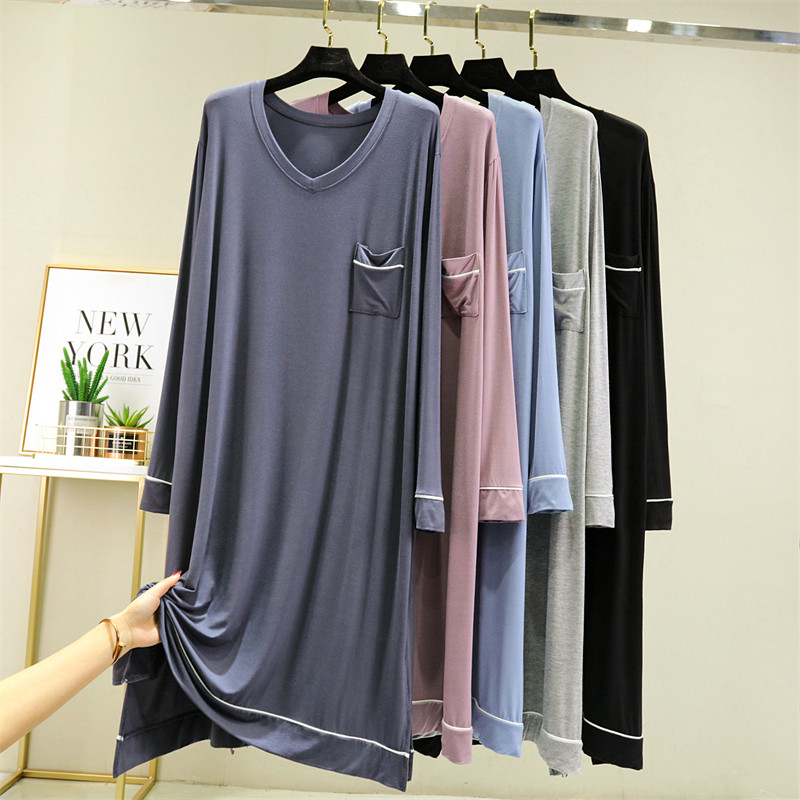 春夏薄款宽松莫代尔家居服女大码V领连衣裙长袖睡裙休闲时尚a字裙