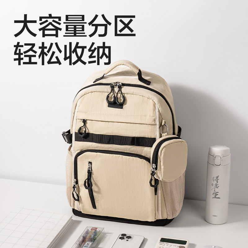 得力书包高初中学生护脊减负简约纯色双肩背包大容量男生女孩黑色