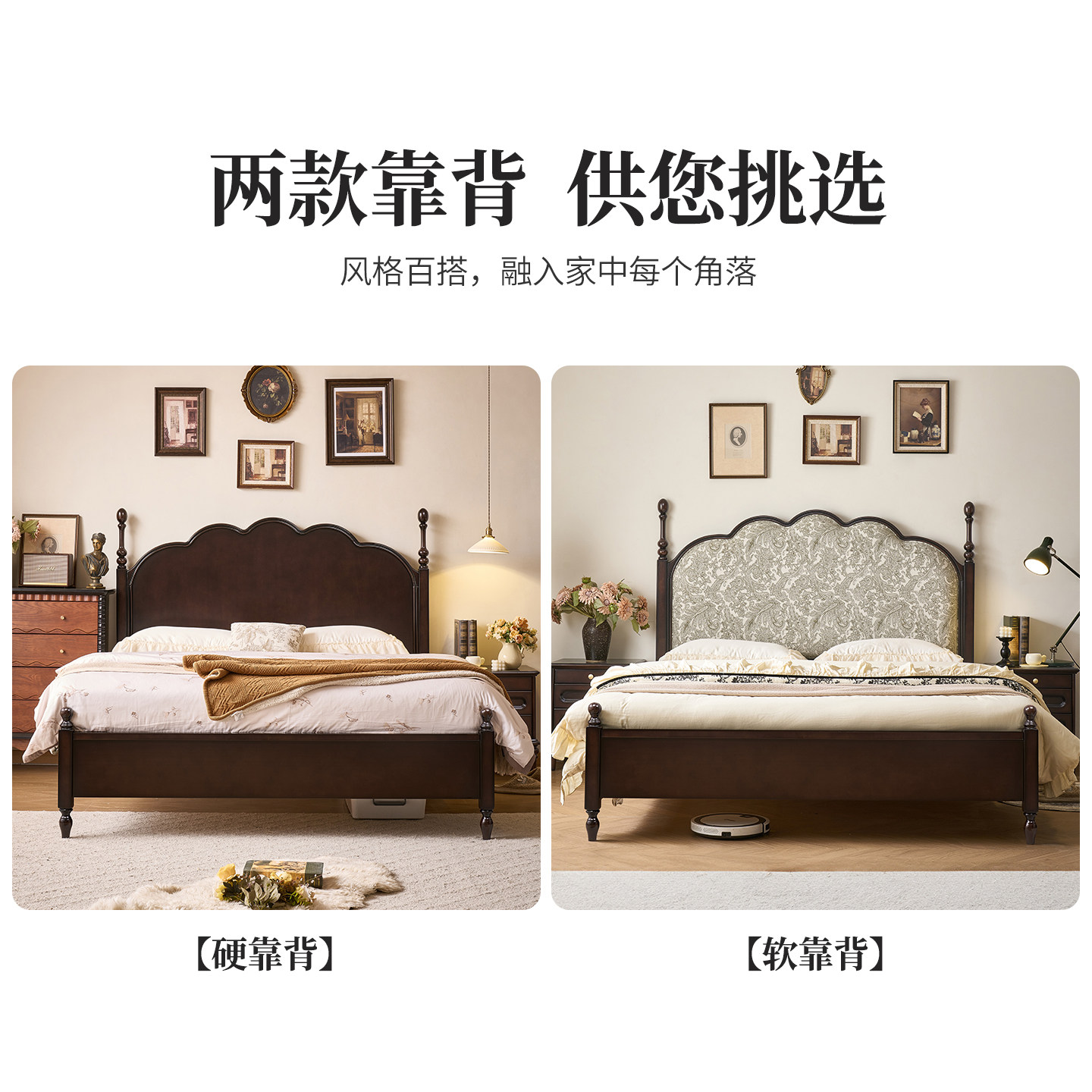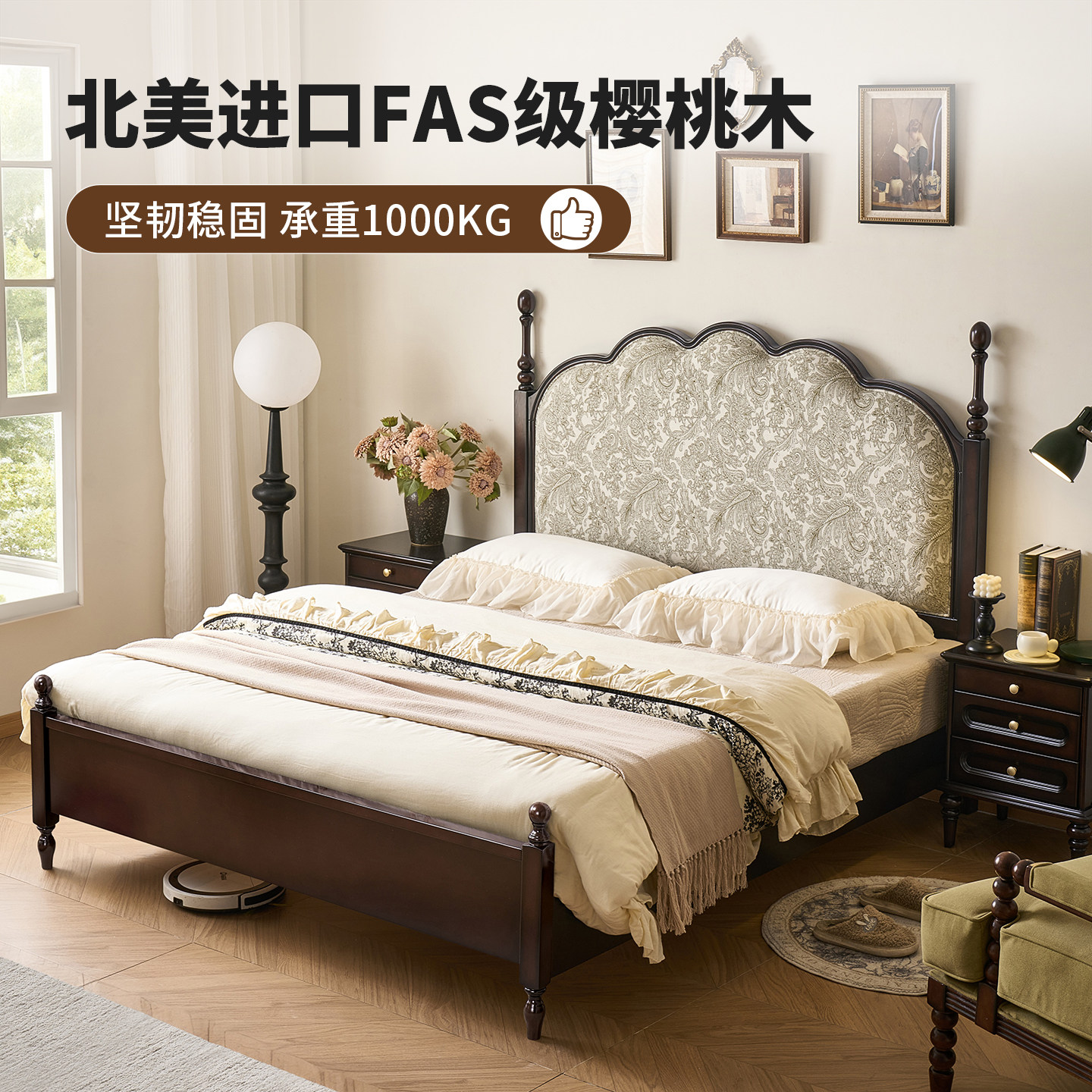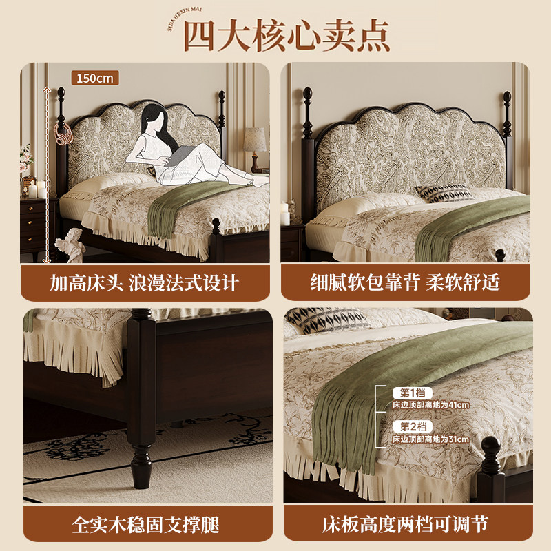 法式复古床樱桃木实木床1.5M1.8米单双人床美式软包床主卧2米大床