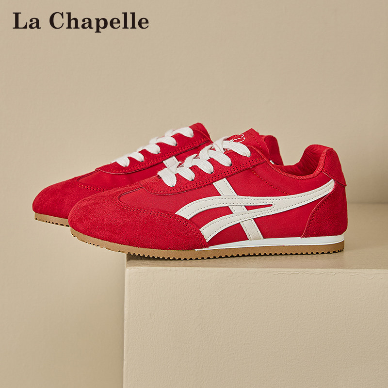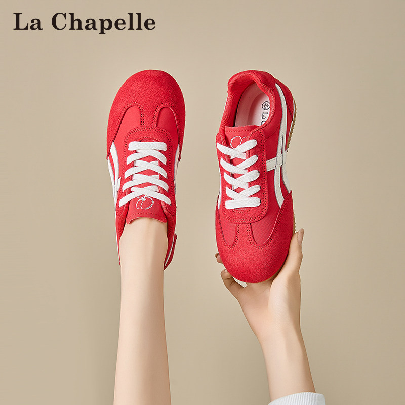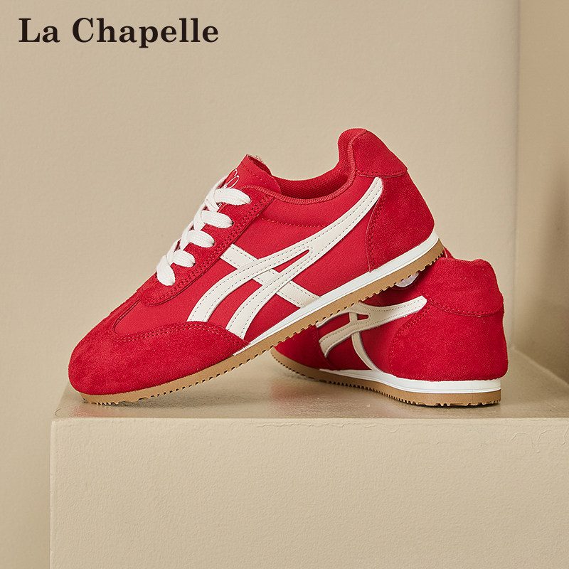 拉夏贝尔复古红色内增高德训鞋女2026新款春季平底运动休闲阿甘鞋