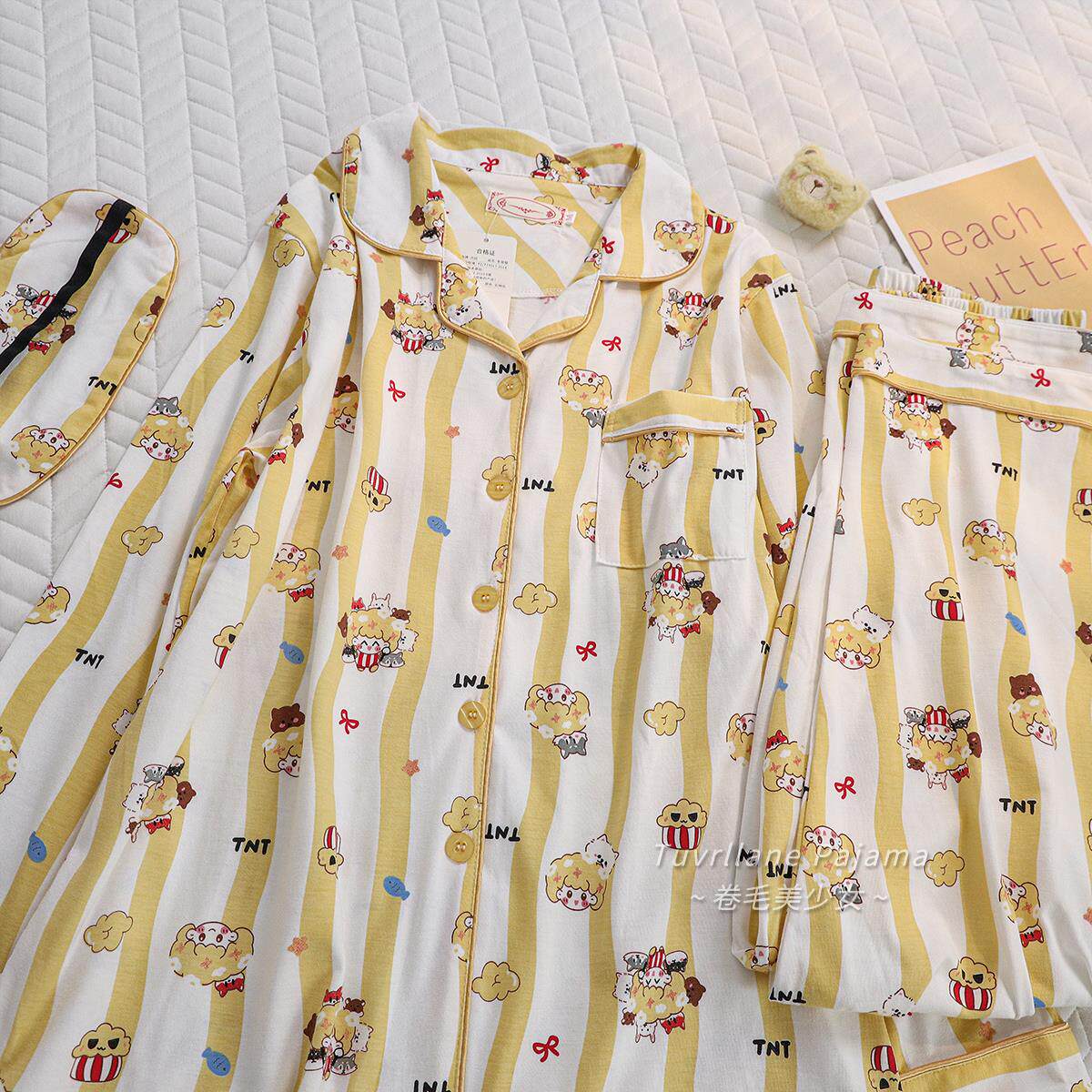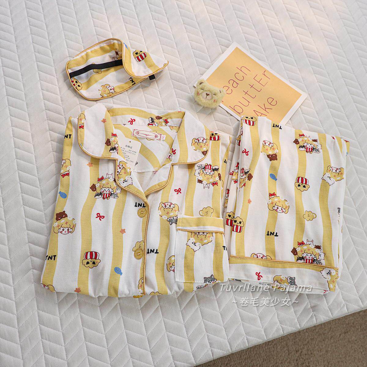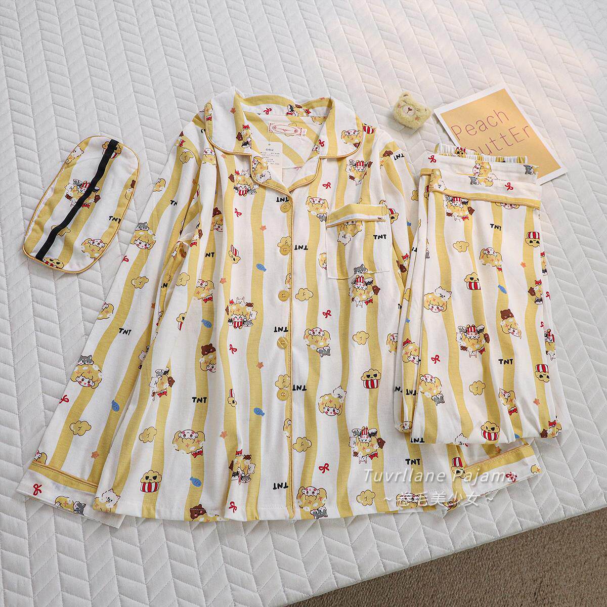 日系卡通印花纯棉长袖睡衣女款春秋季新款休闲黄色条纹家居服套装
