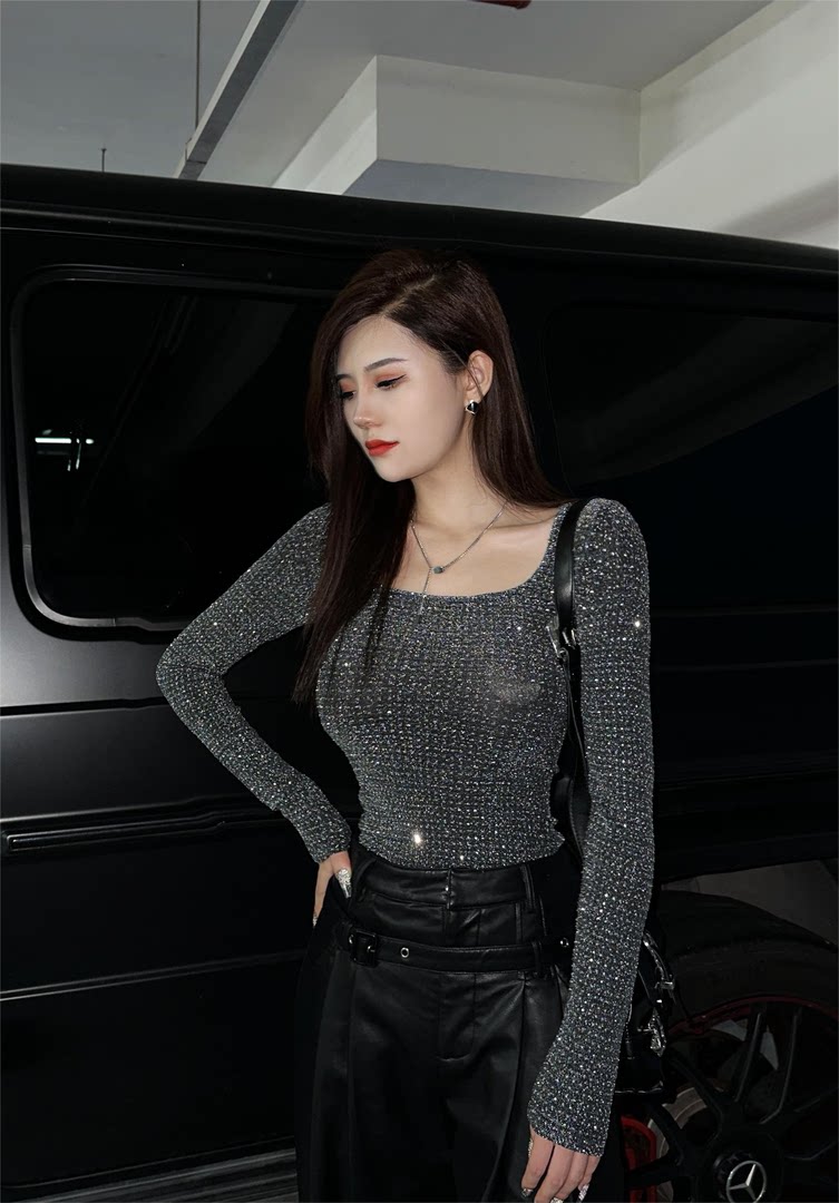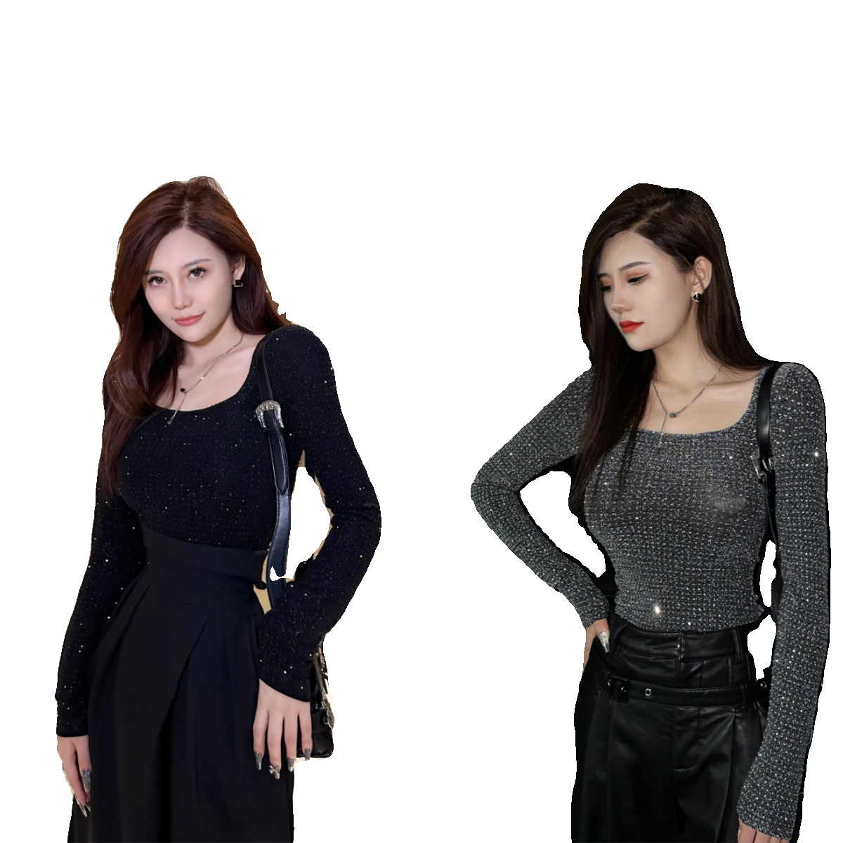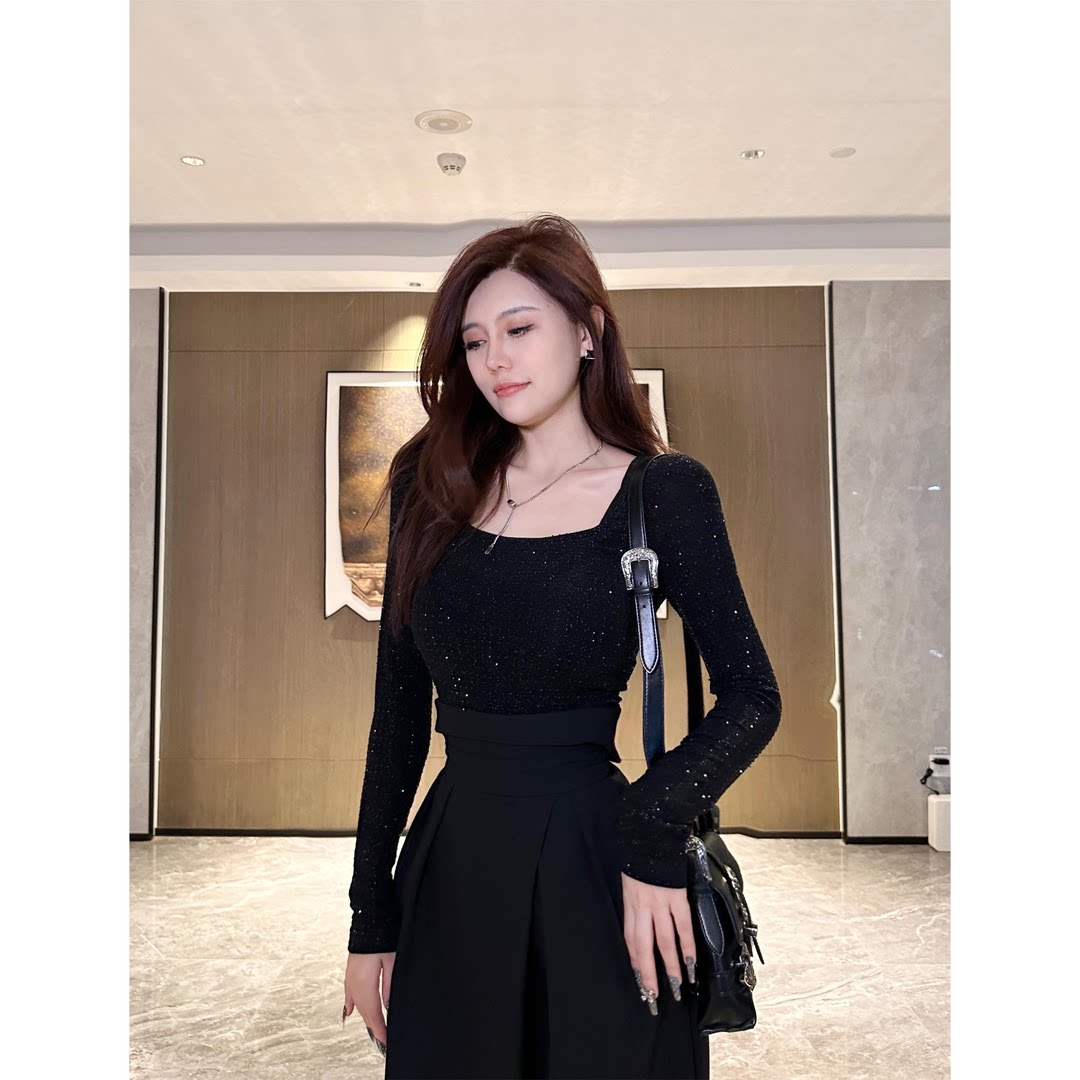 时尚闪钻设计感长袖修身上衣黑色小众秋冬网红款2026年新款气质