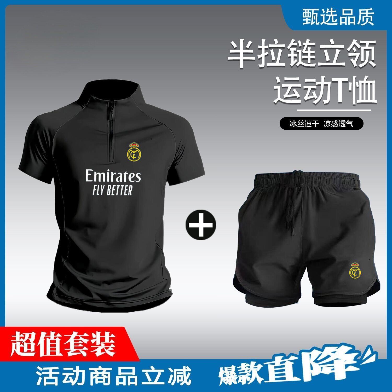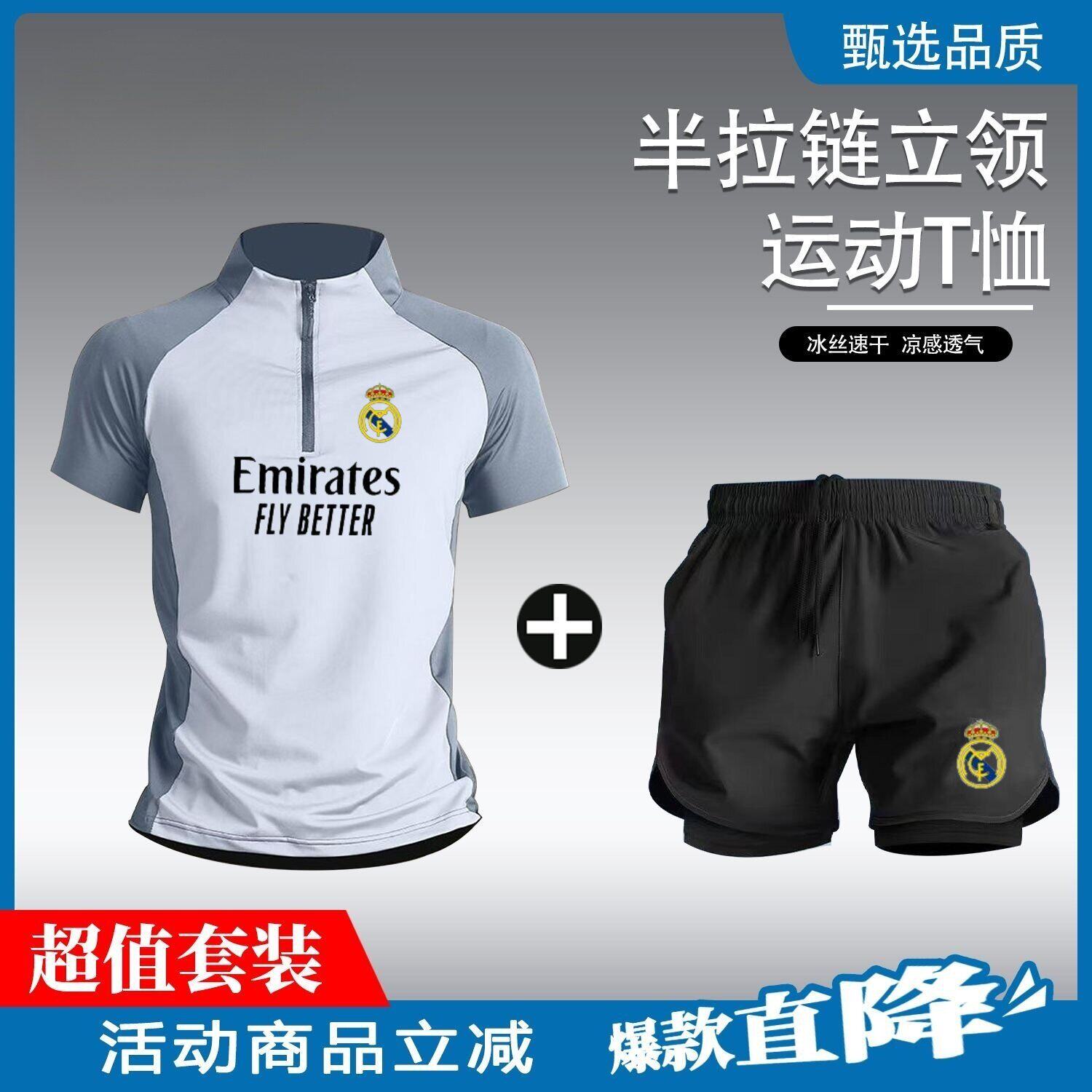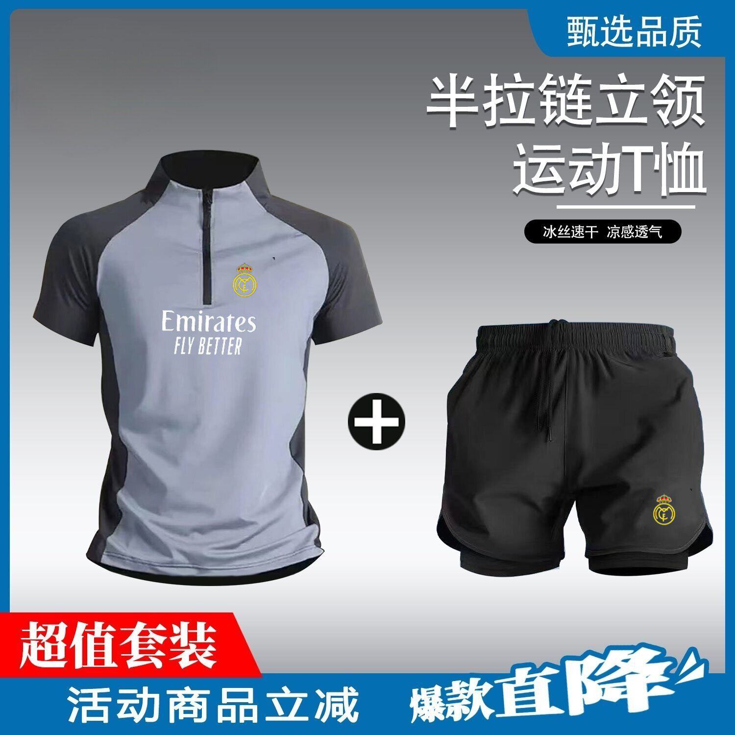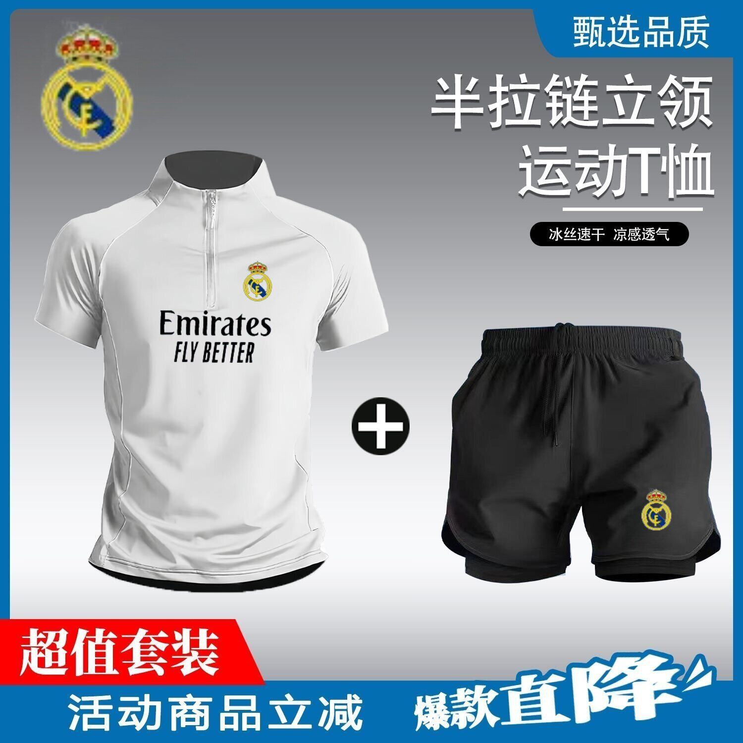2526皇家马德里同款半拉链足球训练服运动套装男跑步速乾短裤短袖