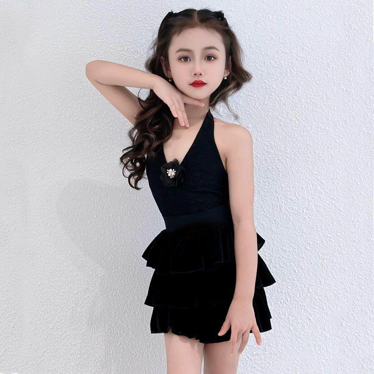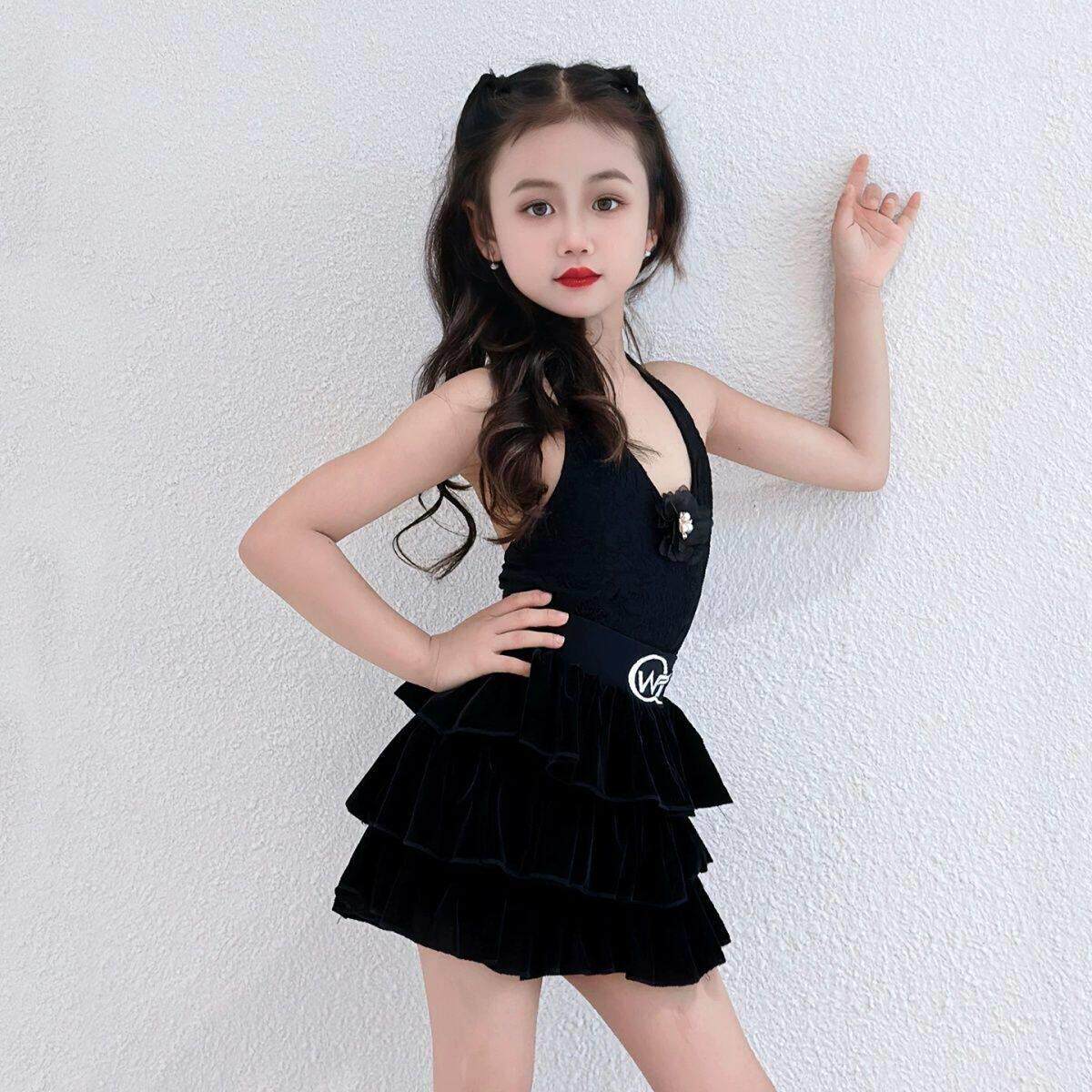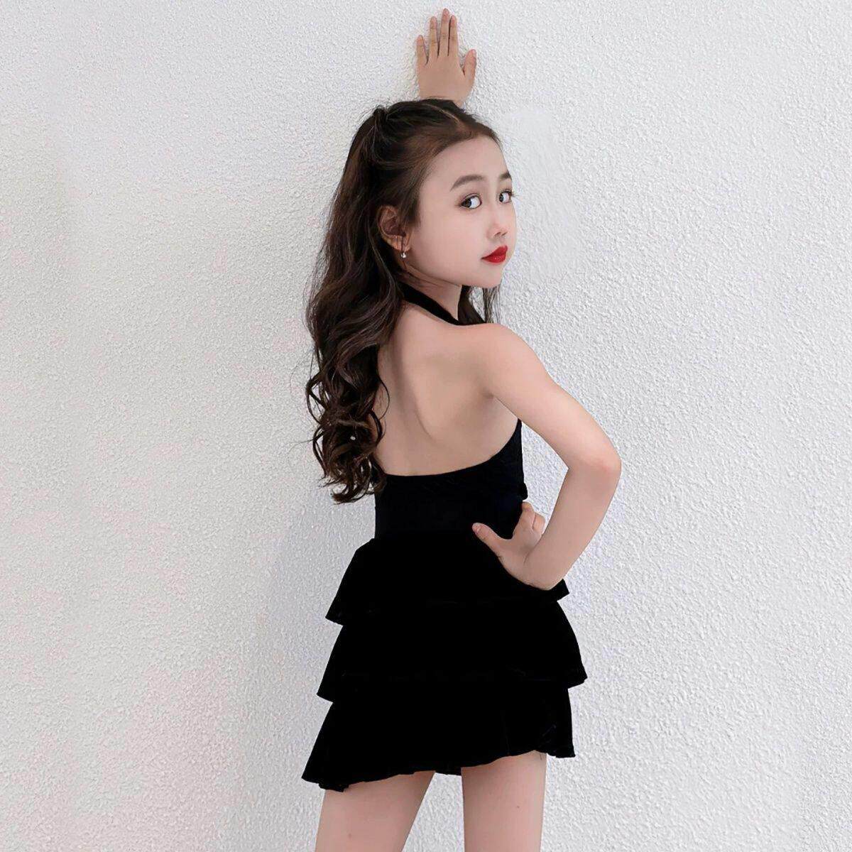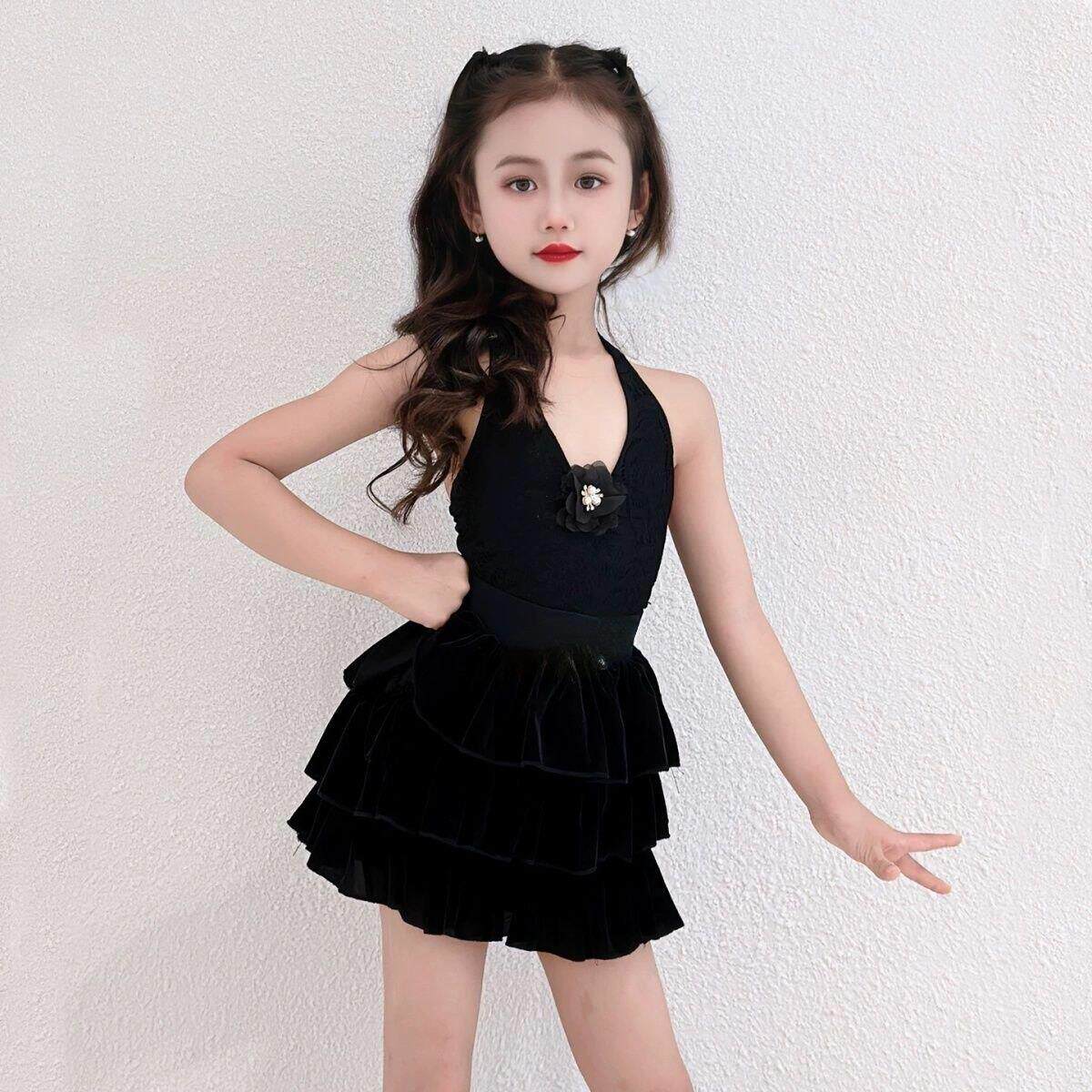 2025新款女童拉丁舞练功服网纱黑色高级感挂脖演出表演比赛蛋糕裙