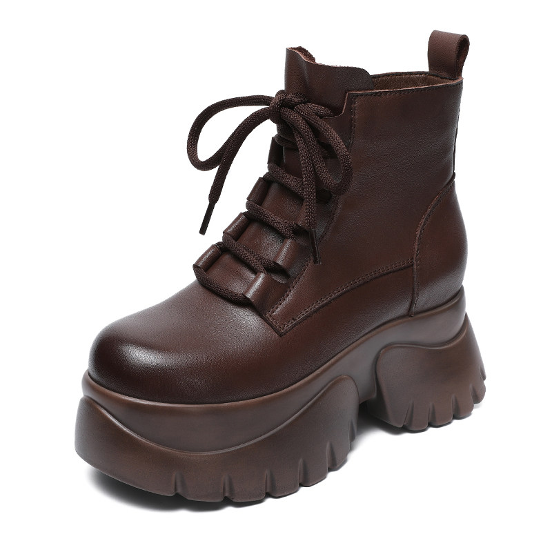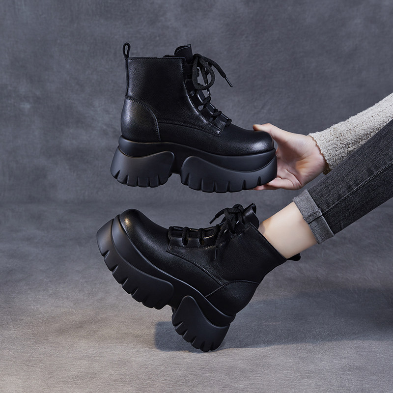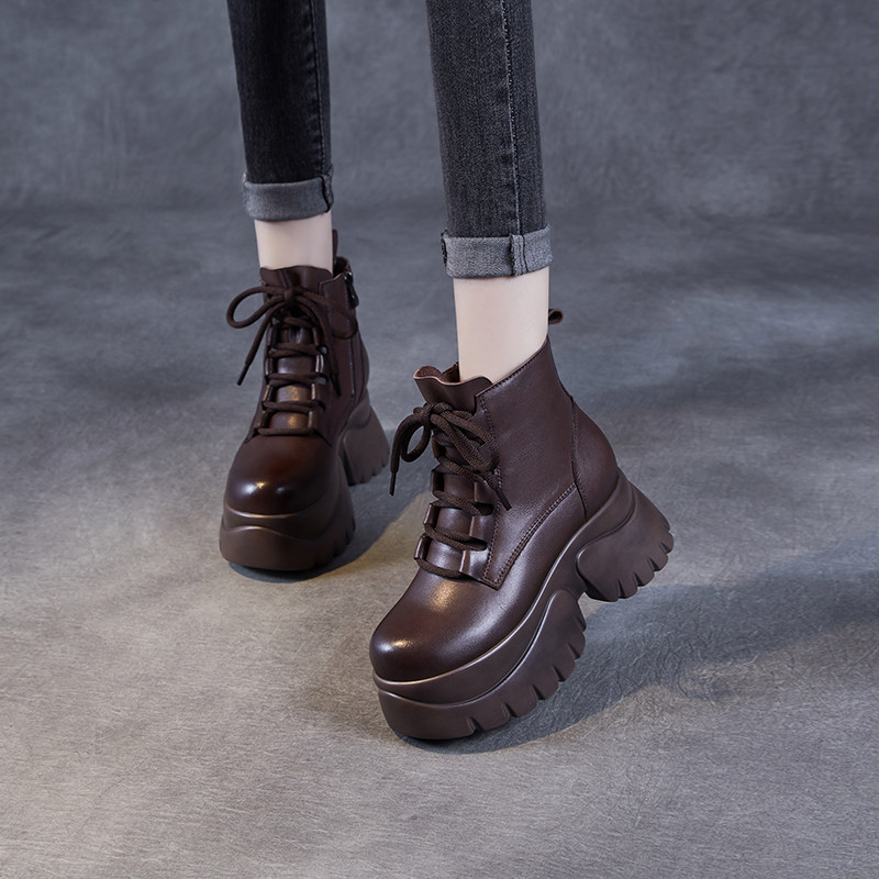 头层牛皮厚底短靴女2025秋冬松糕加绒棉鞋内增高小个子真皮马丁靴