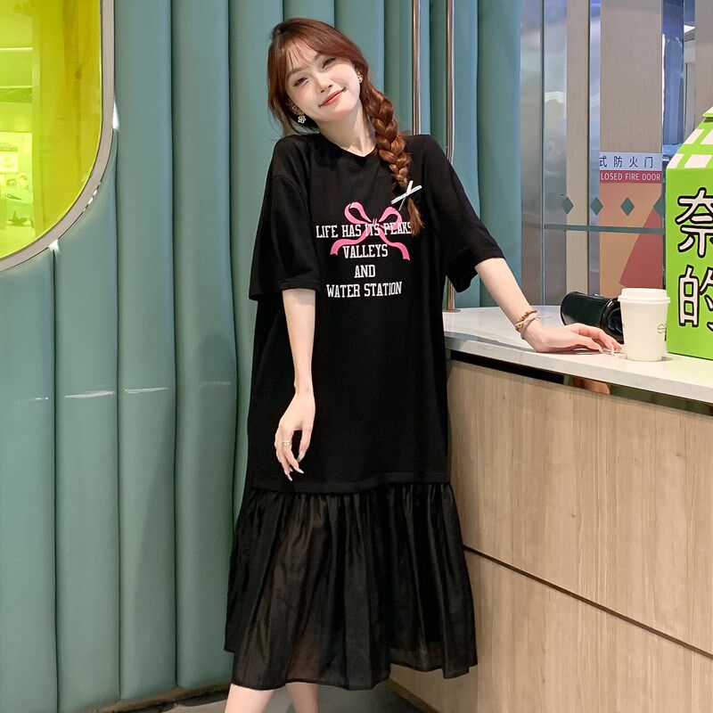 大码仙气连衣裙胖mm巨显瘦遮肚子雪纺拼接长裙纯棉夏装短袖t恤裙
