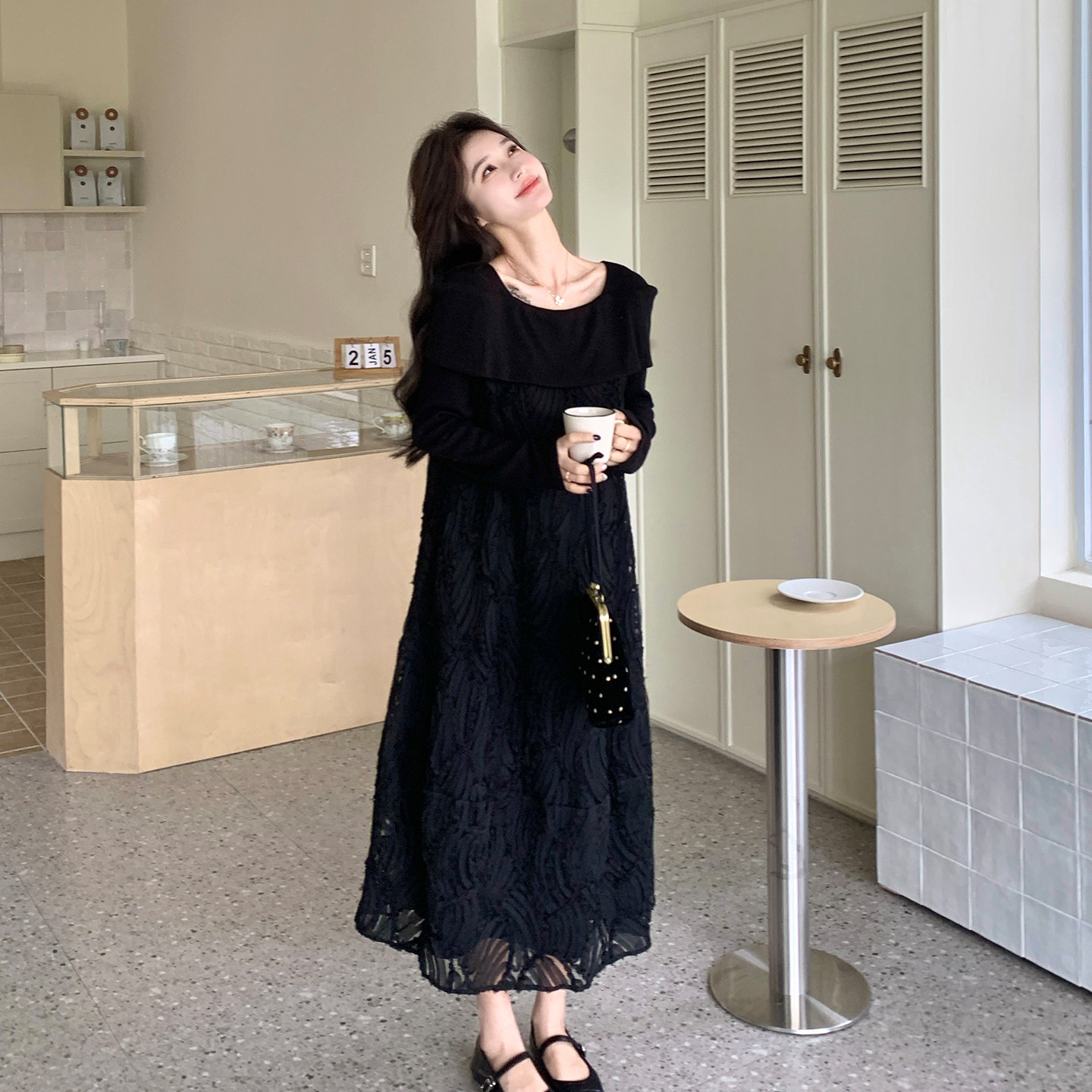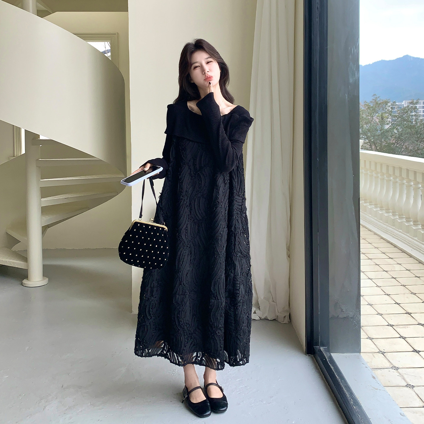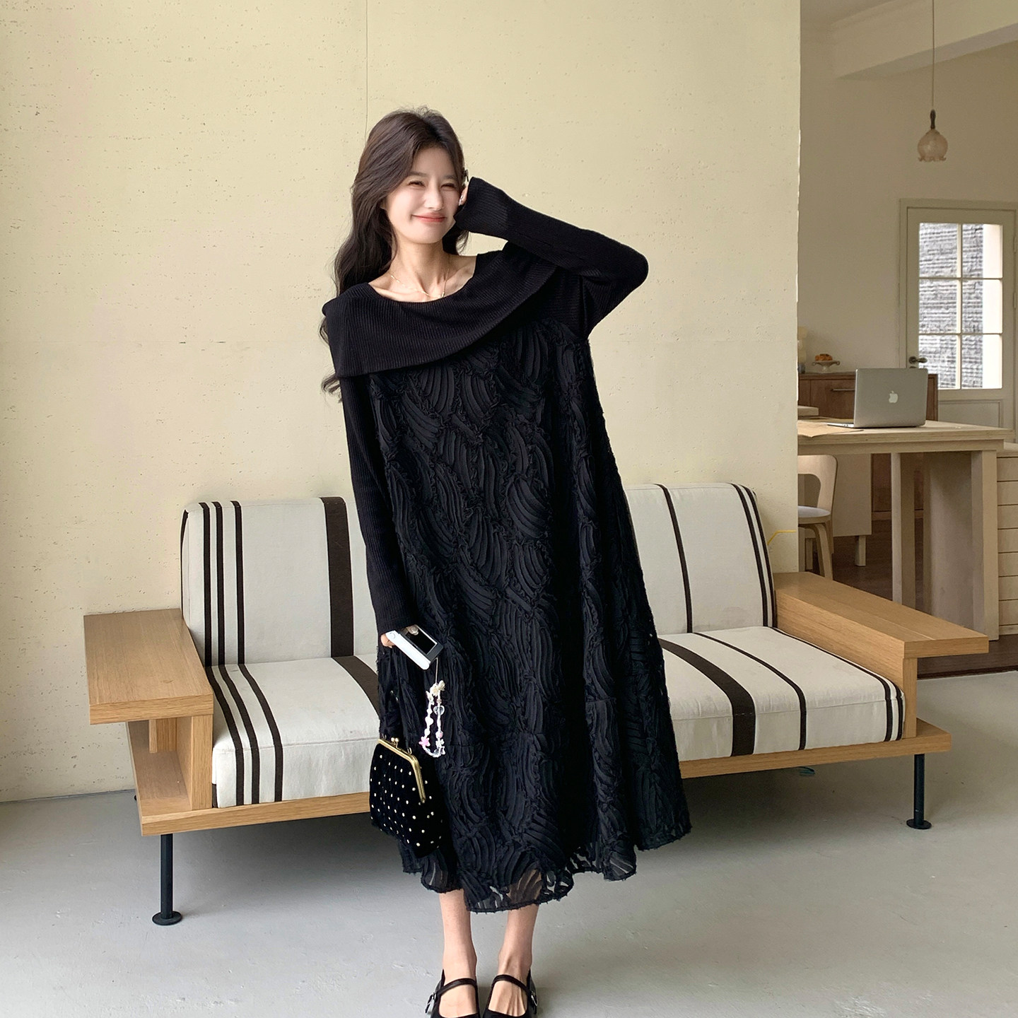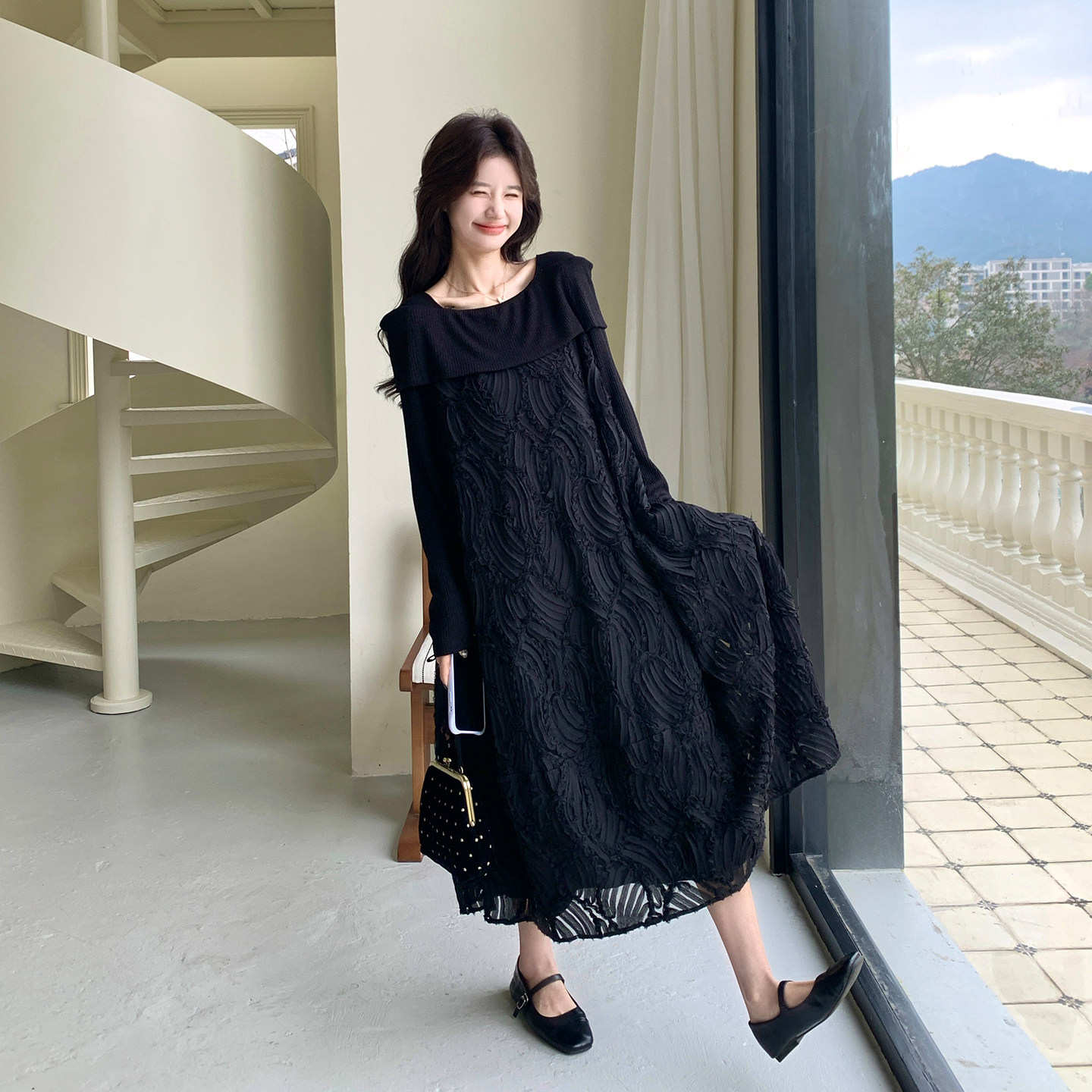 黑色法式轻熟高级感长袖连衣裙女2026早春新款时尚设计感A字长裙