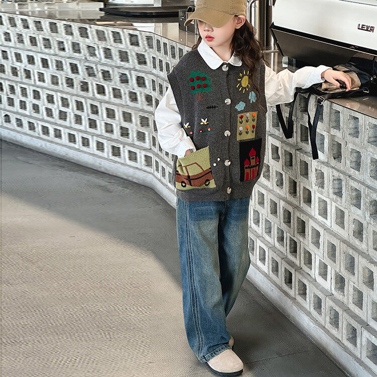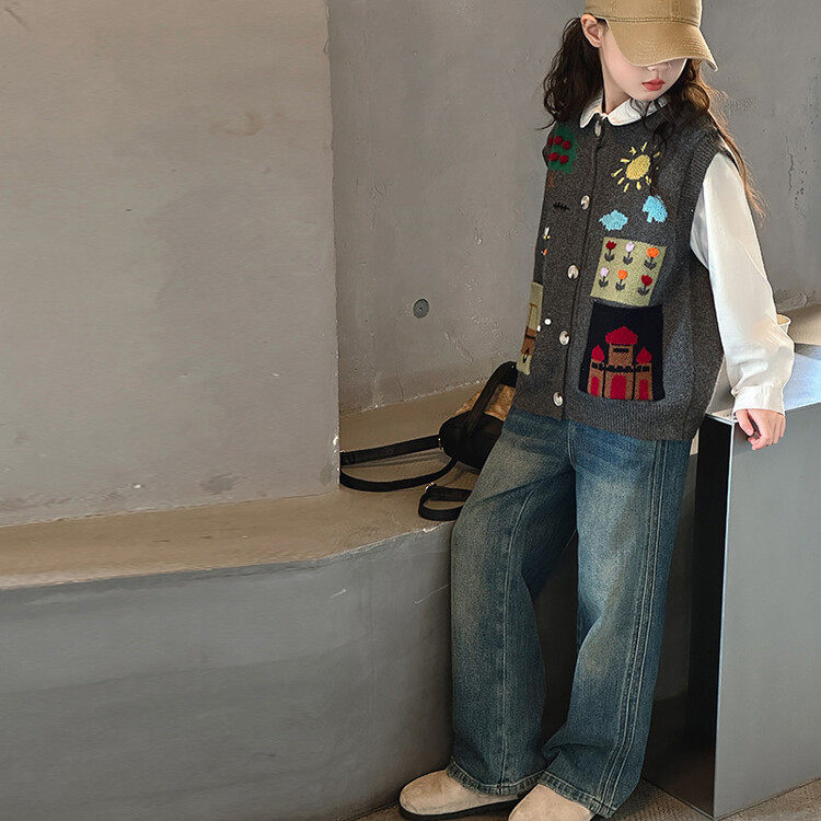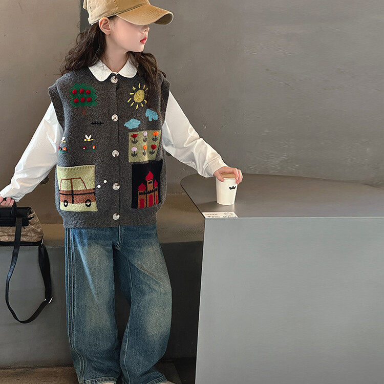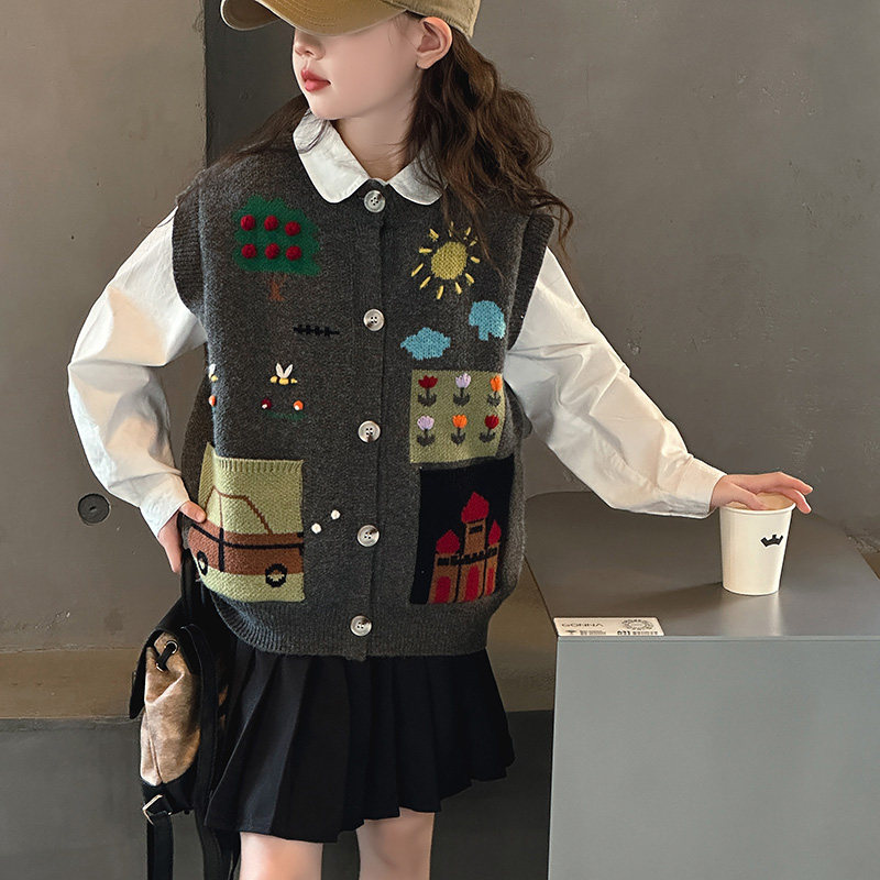 女童韩版绣花开衫学院风毛衣马甲2026新款春季儿童针织衫裤子套装