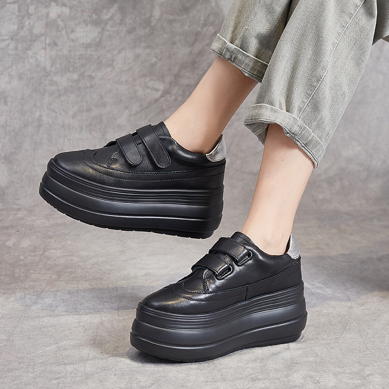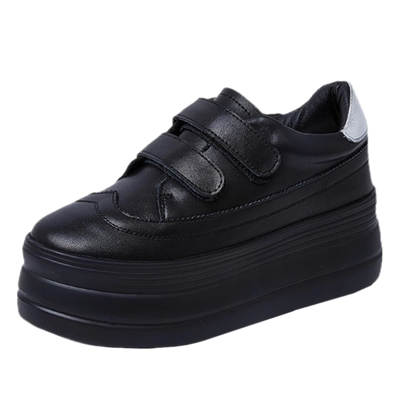 黑色真皮懒人秋季单鞋女新款厚底增高8CM魔术贴休闲松糕棉鞋百搭