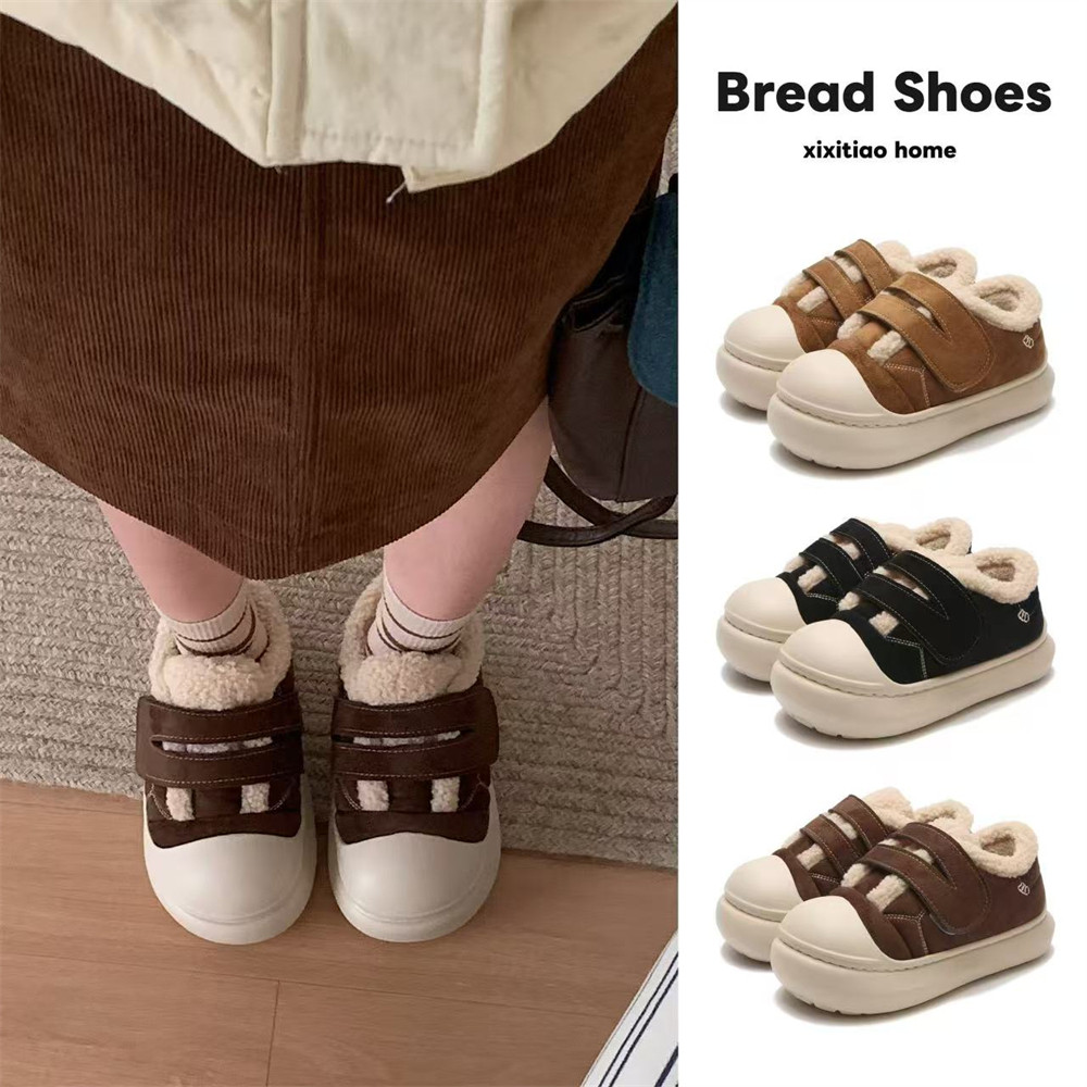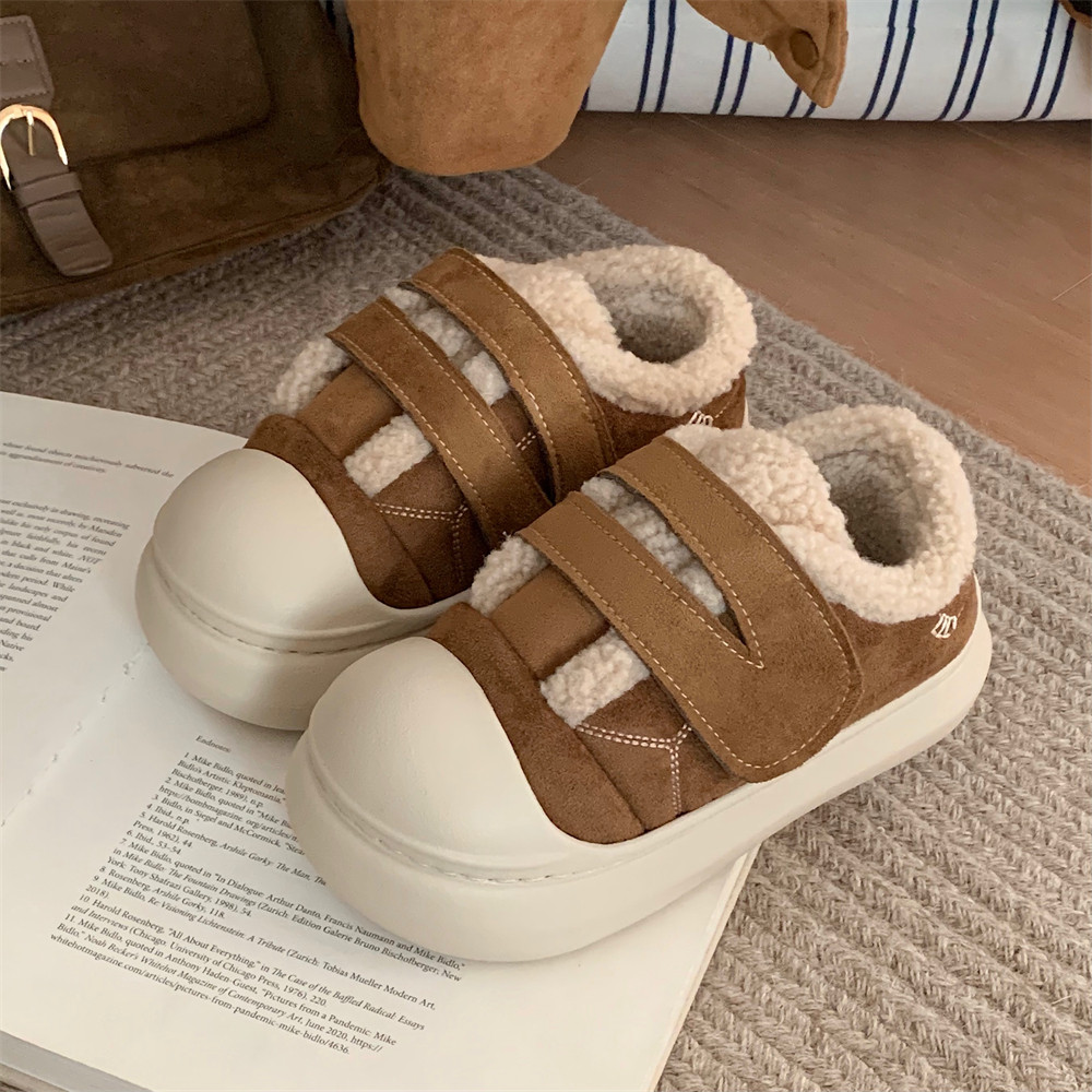 细细条女士新款毛毛鞋棉鞋运动冬季加绒魔术贴厚底板鞋百搭黑色