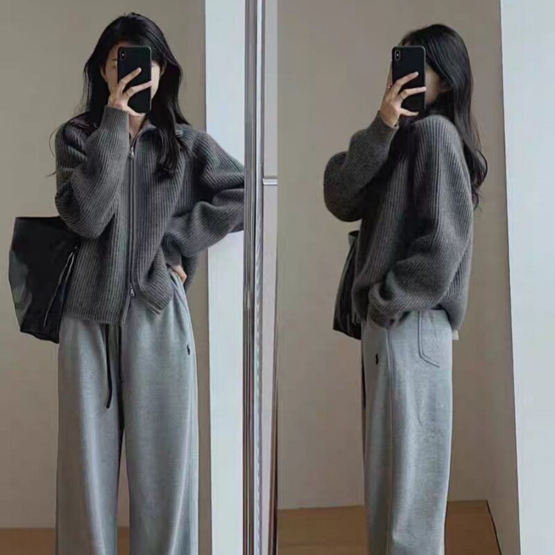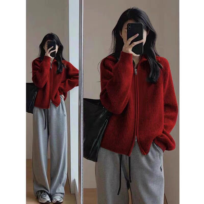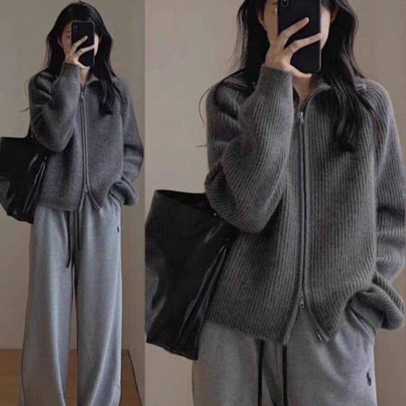 秋冬100%纯羊毛开衫女翻领双拉链加厚针织毛衣女宽松外套羊绒上衣