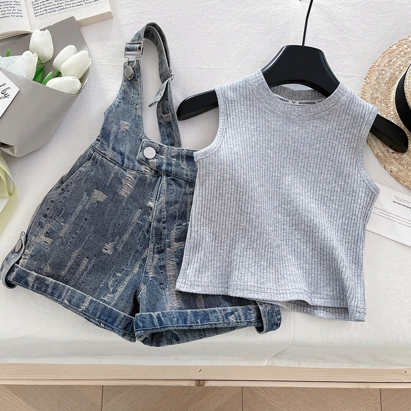 女童夏季背带裤套装2026新款儿童洋气时髦打底衫牛仔短裤两件套潮