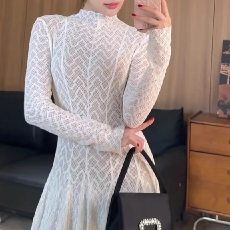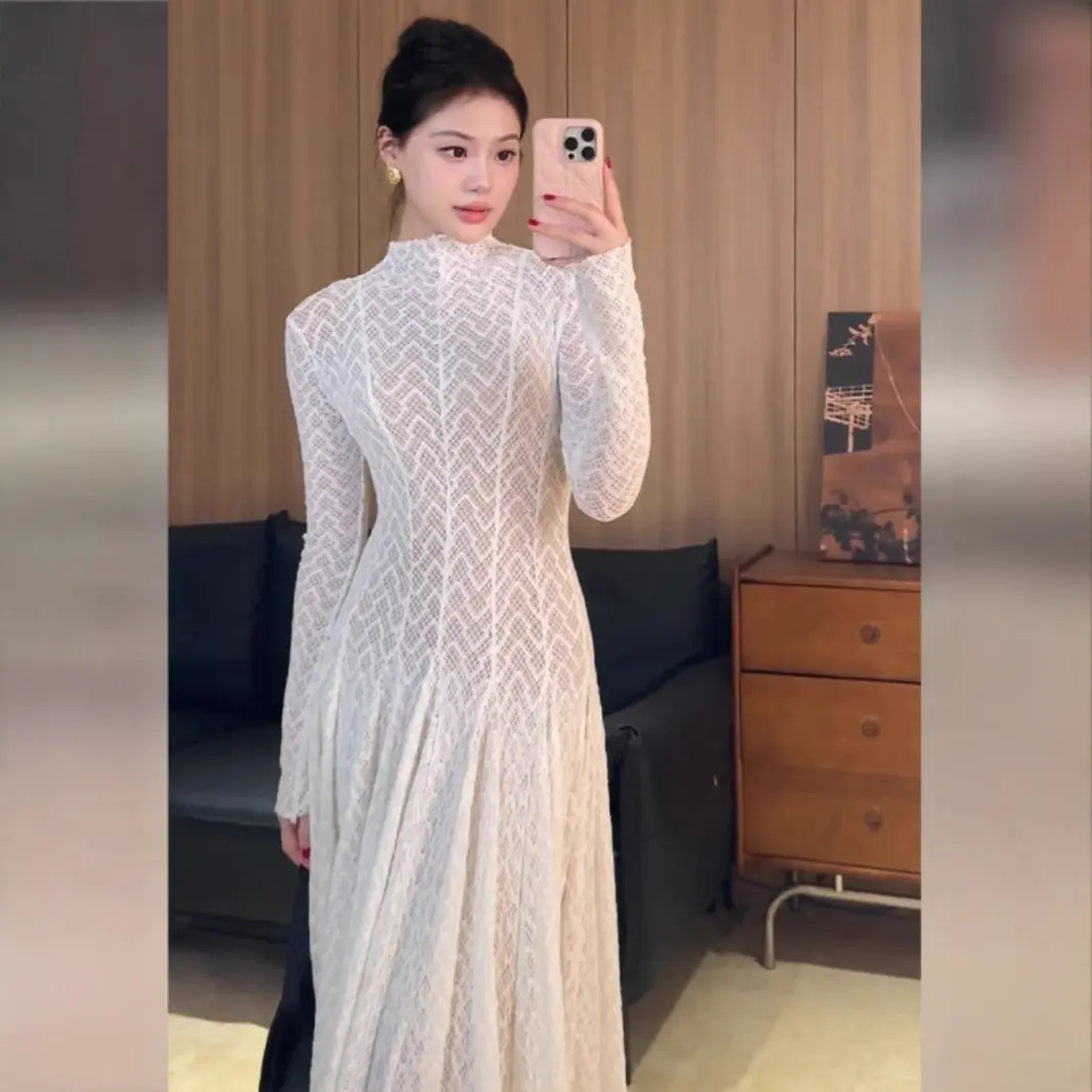 2025早春长袖修身大摆伞裙hj名媛气质蕾丝透视长袖连衣裙长款