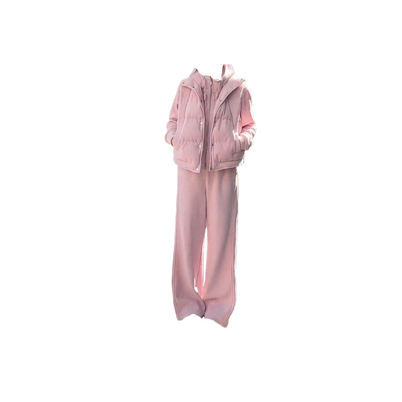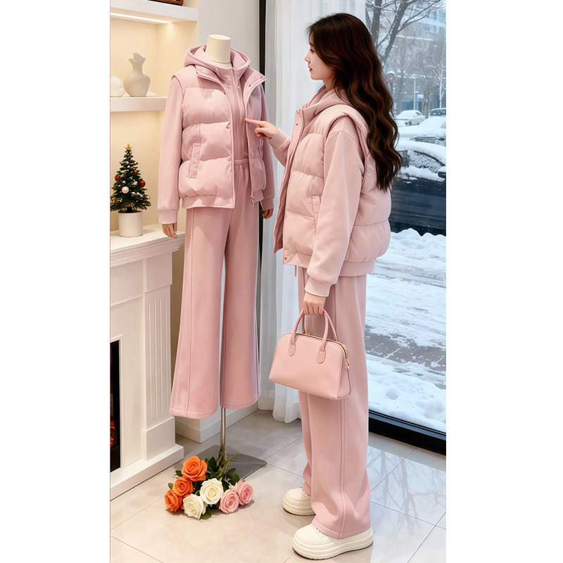 羽绒棉马甲三件套女2026新款冬季休闲运动小个子加绒加厚卫衣套装