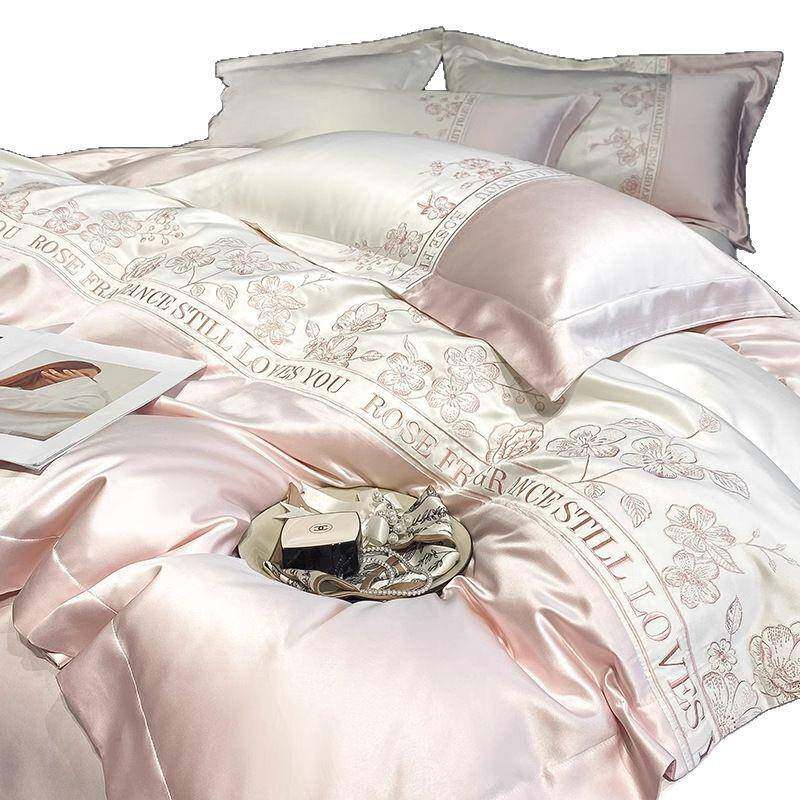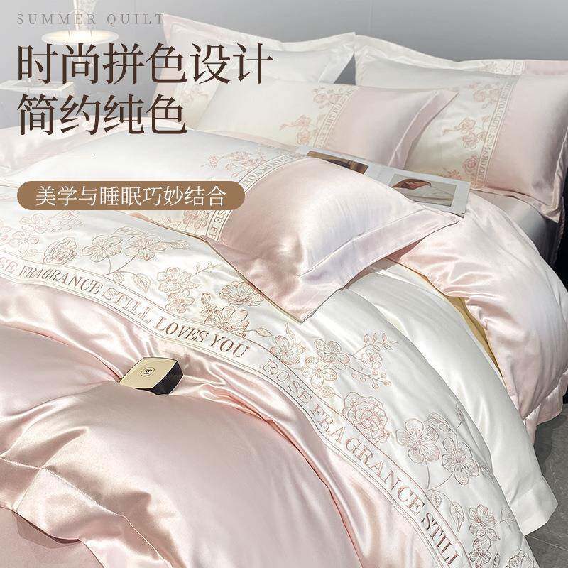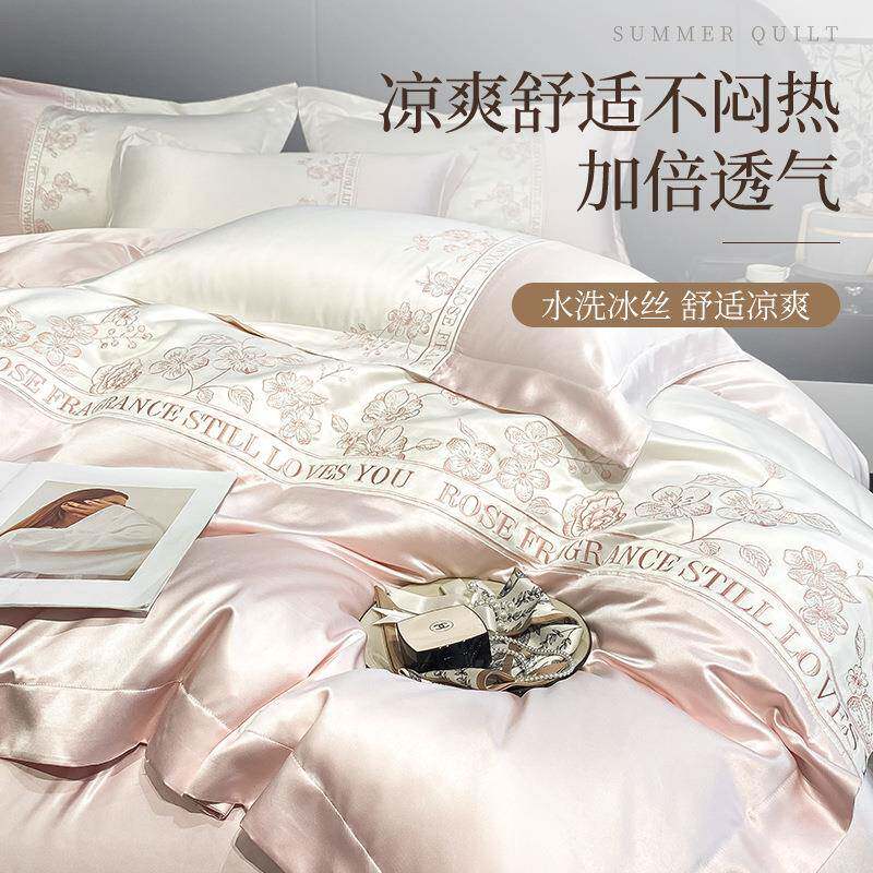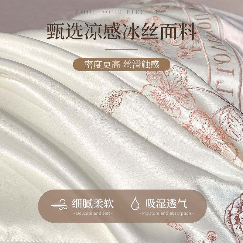轻奢高级感刺绣冰丝四件套夏天丝滑裸睡床上用品被套罩床单床笠款