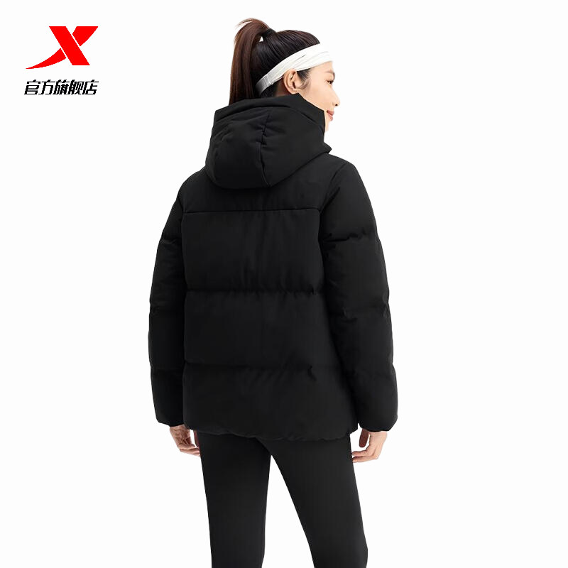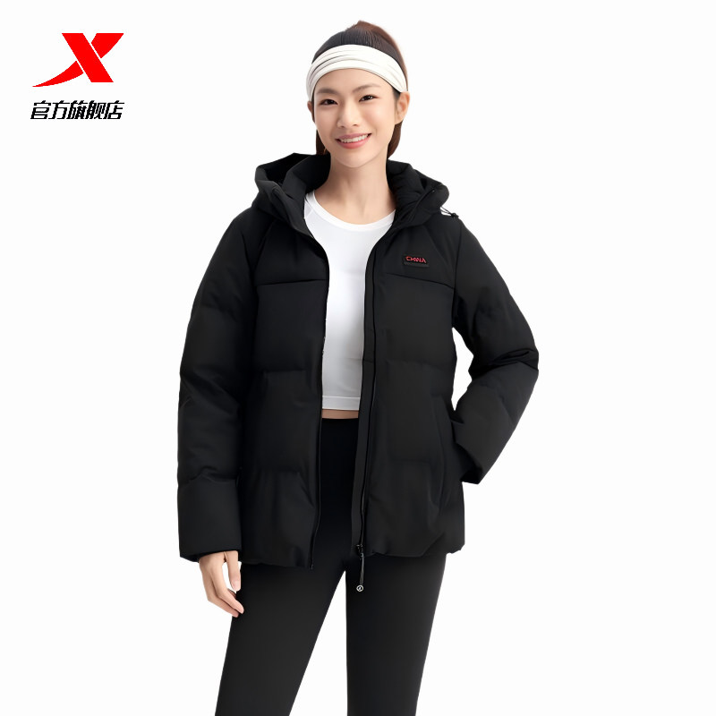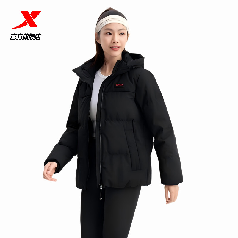 特步CHINA三防羽绒服女款2025冬新款内里热反射连帽鸭绒保暖外套