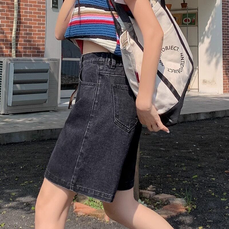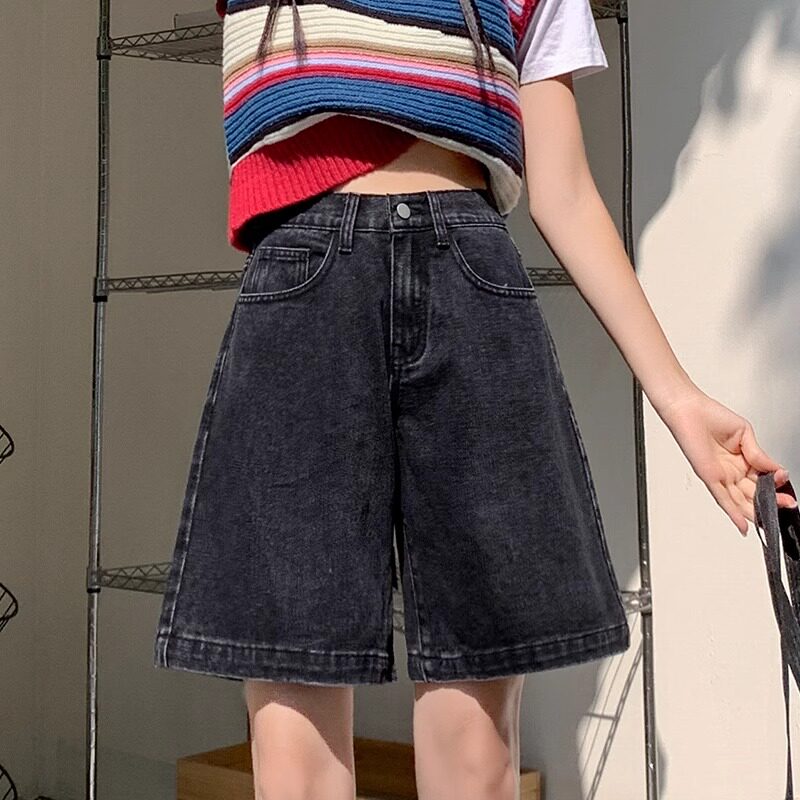夏季薄款黑灰色五分牛仔裤女款小个子显瘦四分马裤松紧腰5分短裤