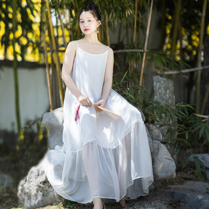 现货【香云薄纱】夏季雪纺吊带连衣裙女新款白色仙气荷叶边长裙子