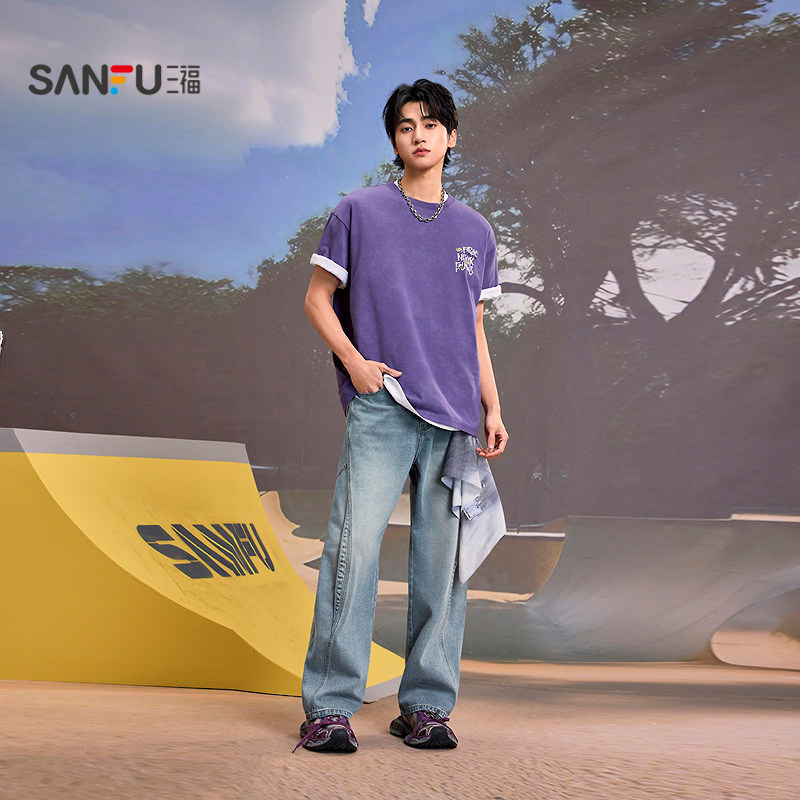 三福2026夏季新款牛仔裤男立体分割街头宽松大直筒长裤裤子522197