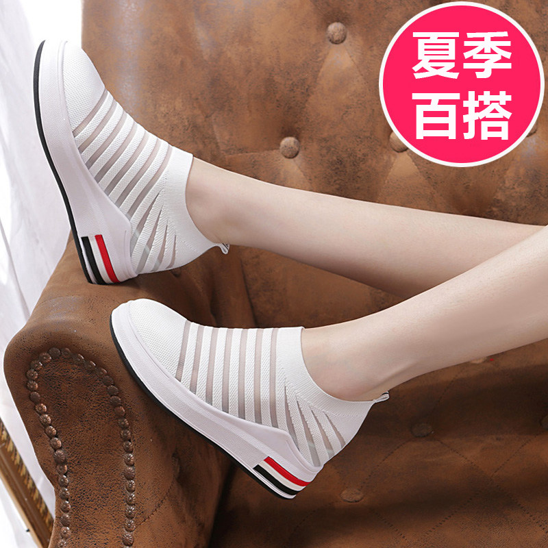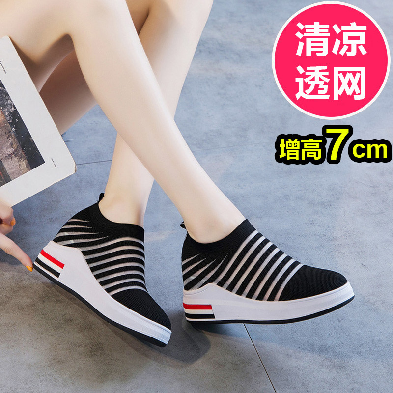 配裙子的小白鞋内增高女鞋7cm网面透气一脚蹬休闲鞋坡跟夏天网鞋