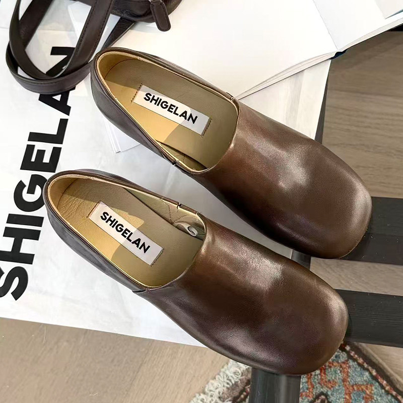 诗歌兰极简风圆头粗跟乐福鞋女2026春季新款真皮一脚蹬百搭小皮鞋