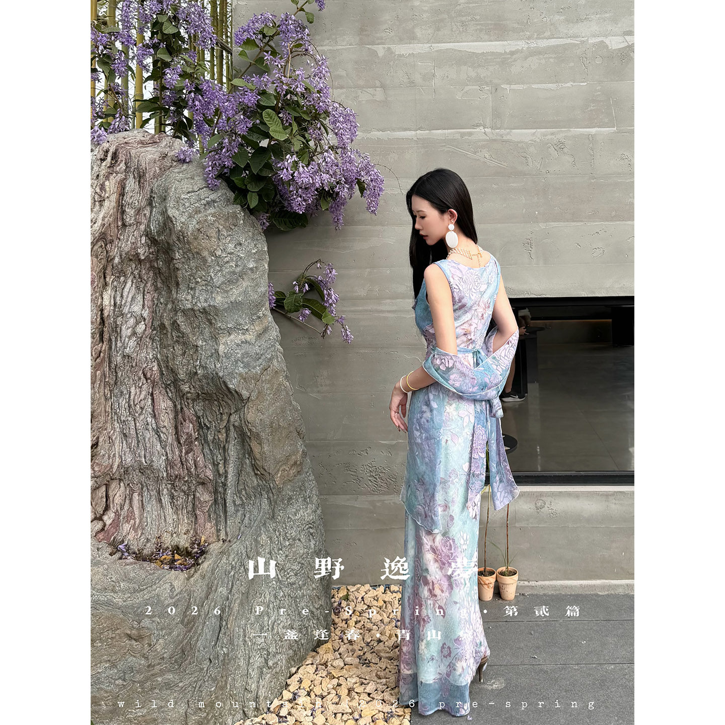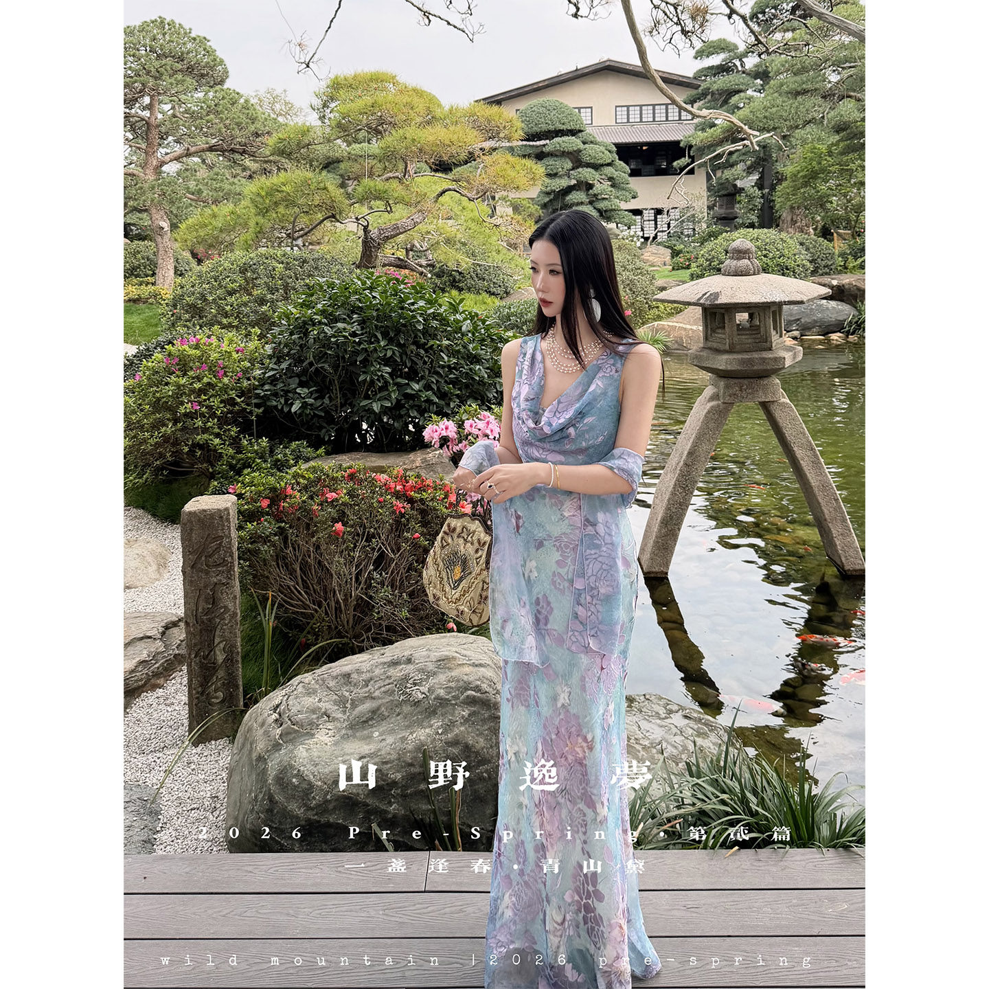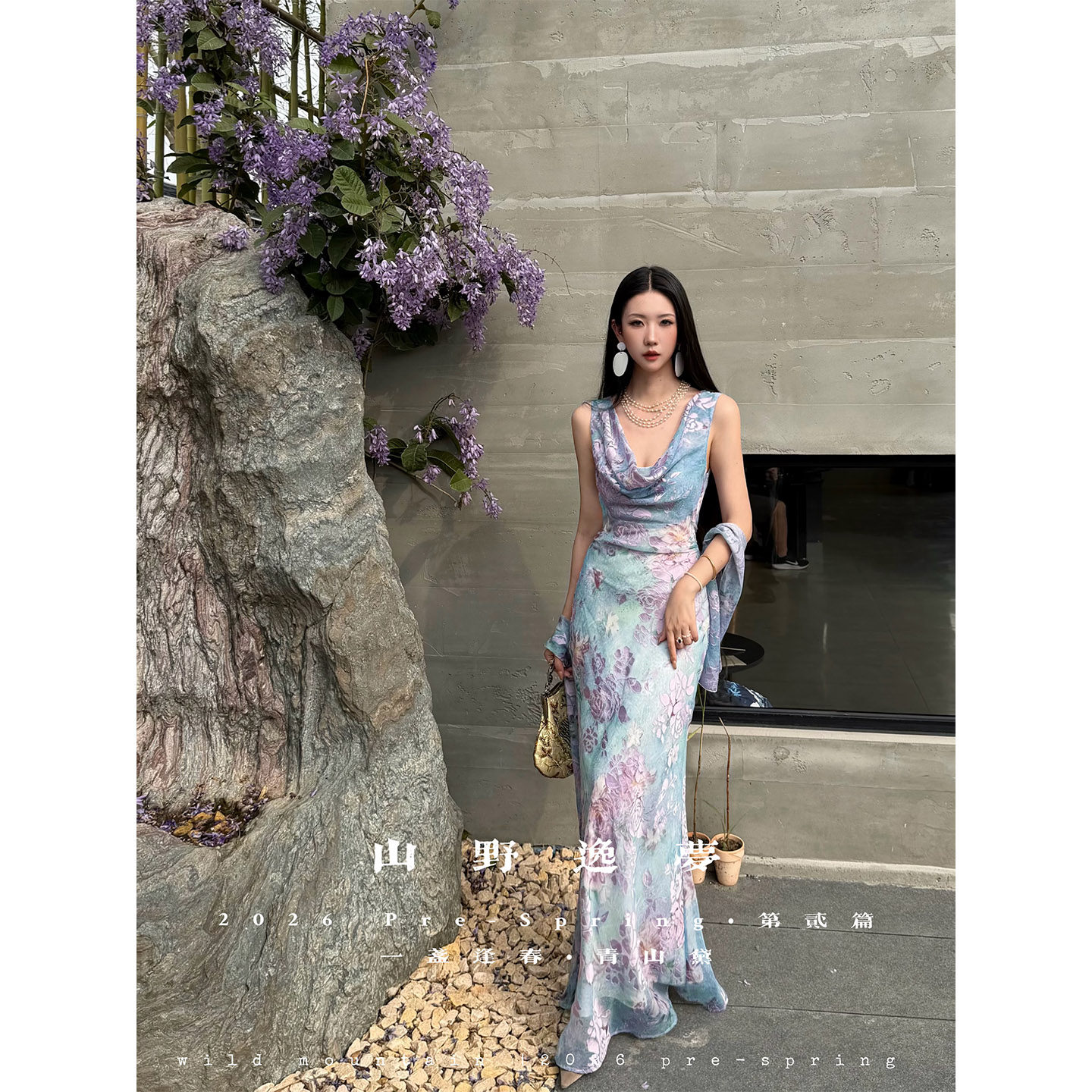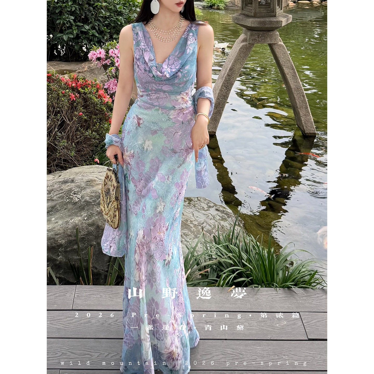 山野逸梦 2026春夏新款荡领碎花连衣裙女夏修身显瘦度假风长裙