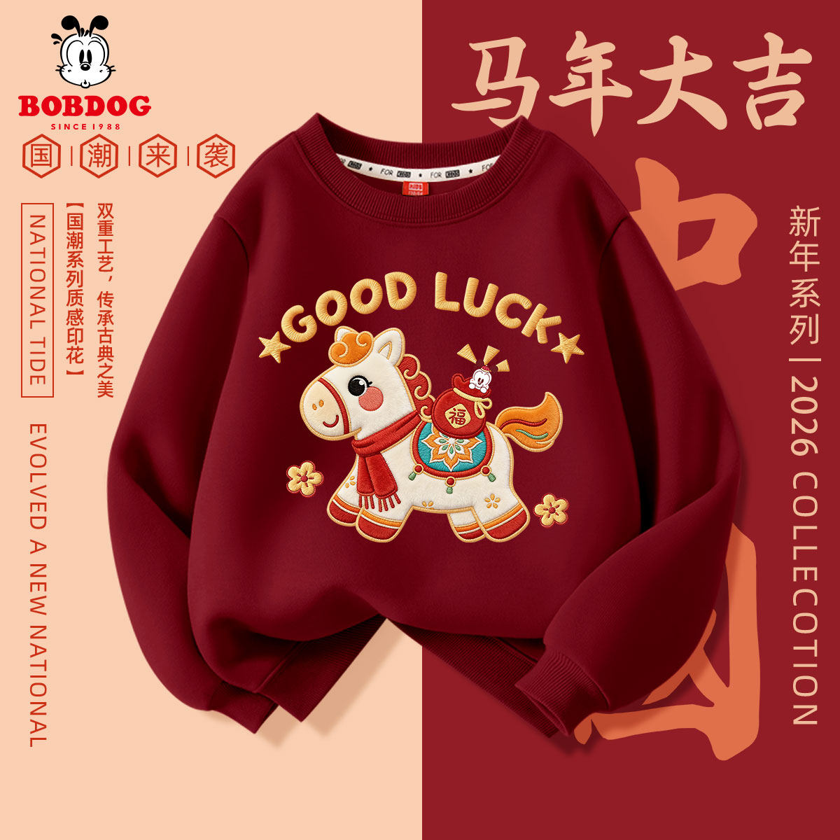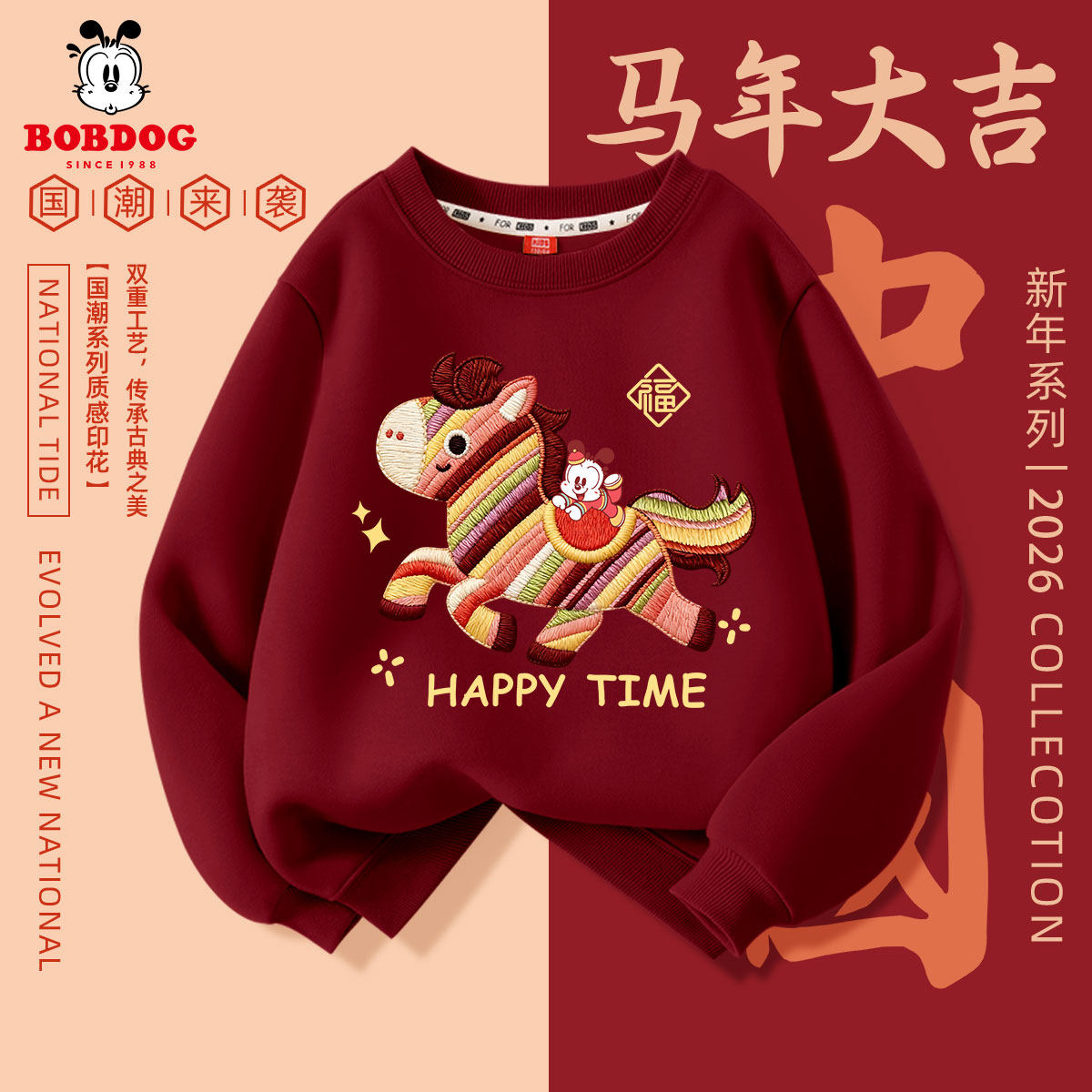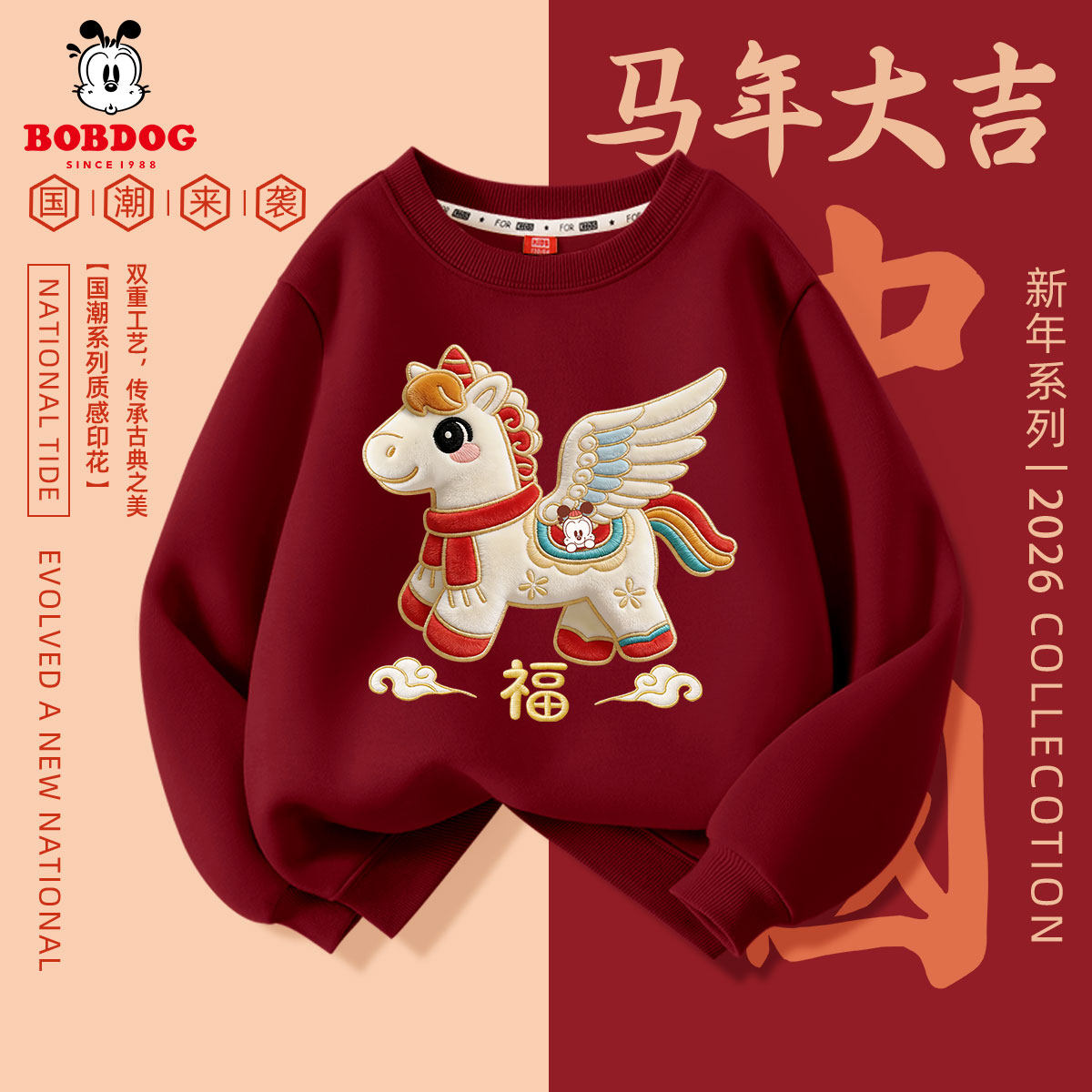 巴布豆女童新年款红色卫衣2026新款儿童马年本命年衣服不加绒春装
