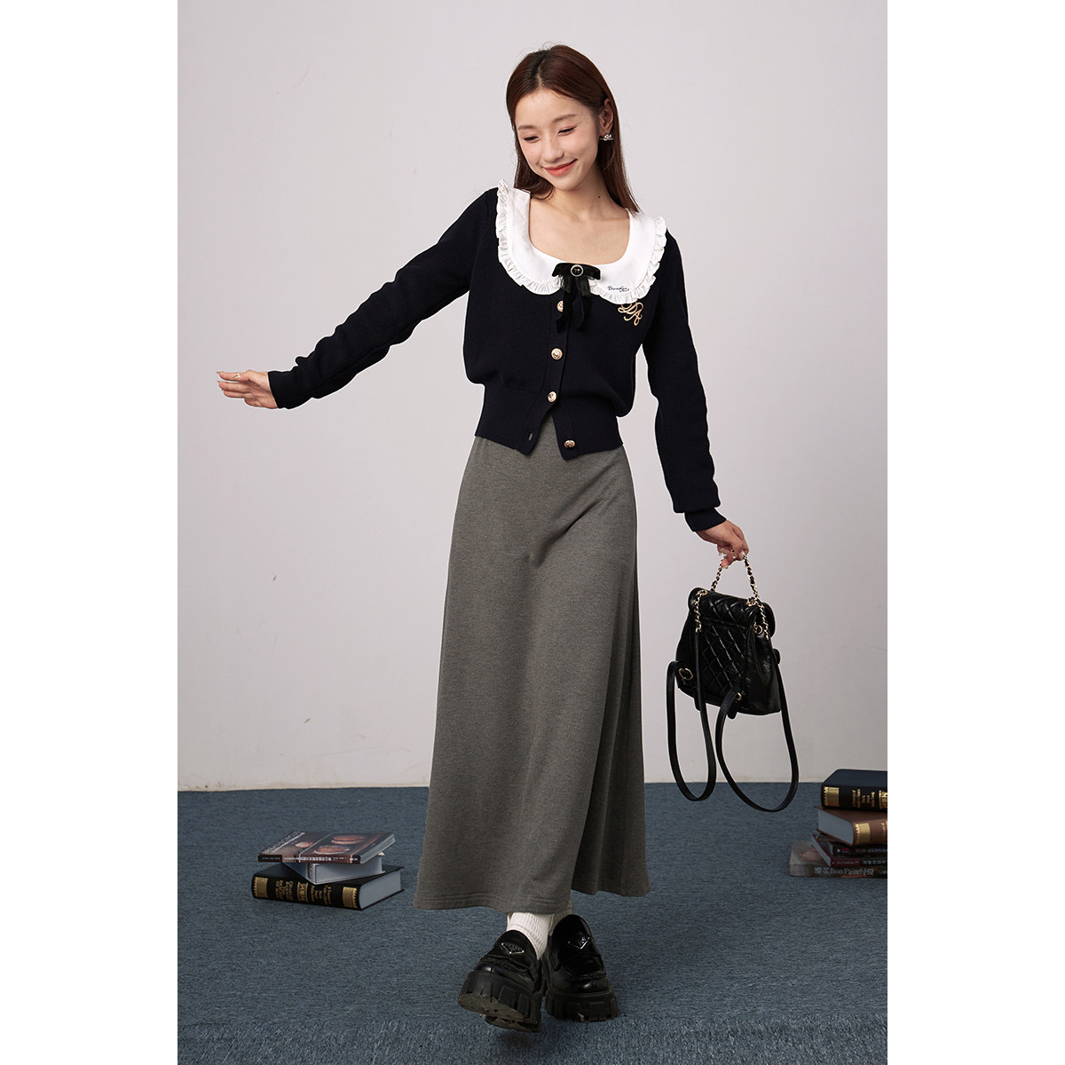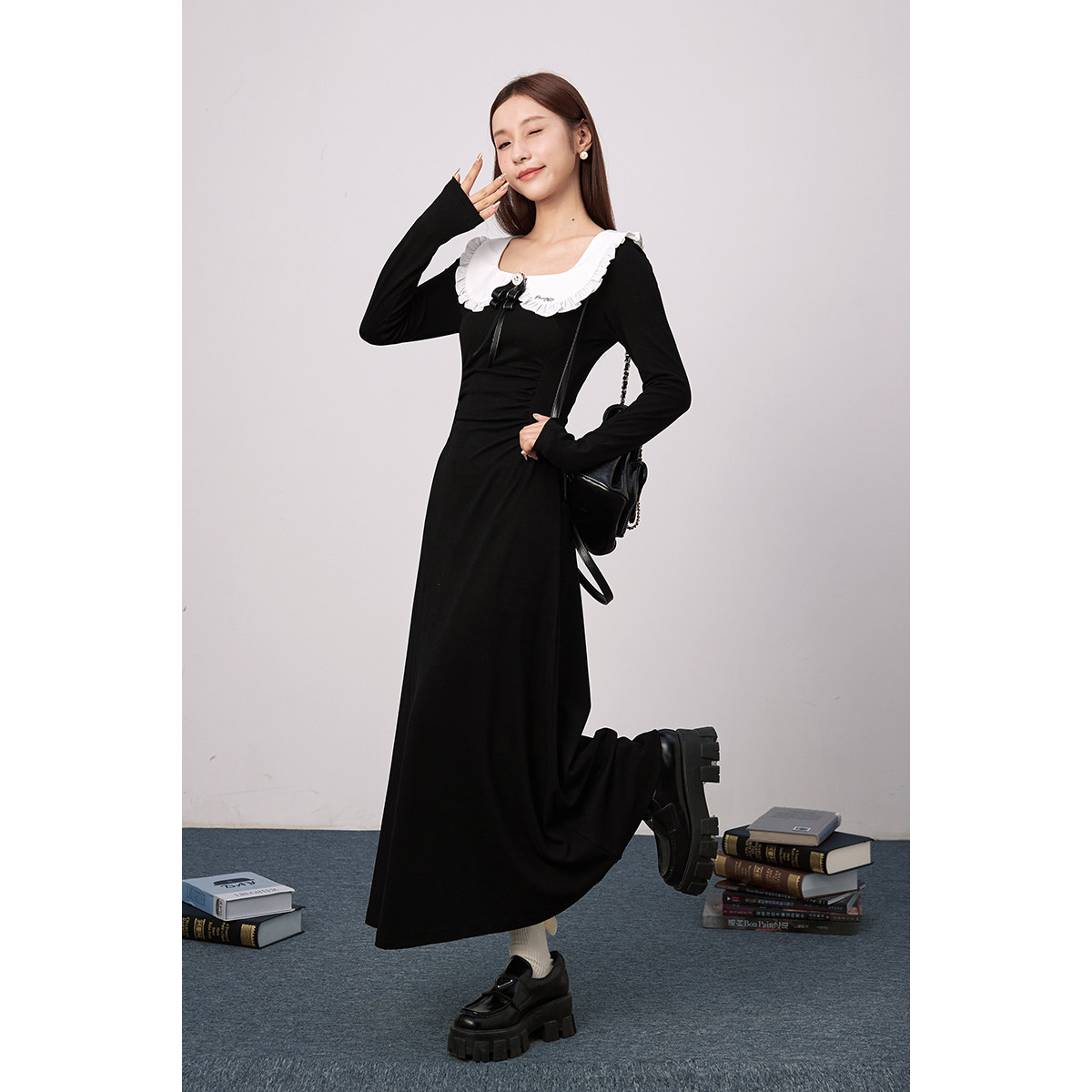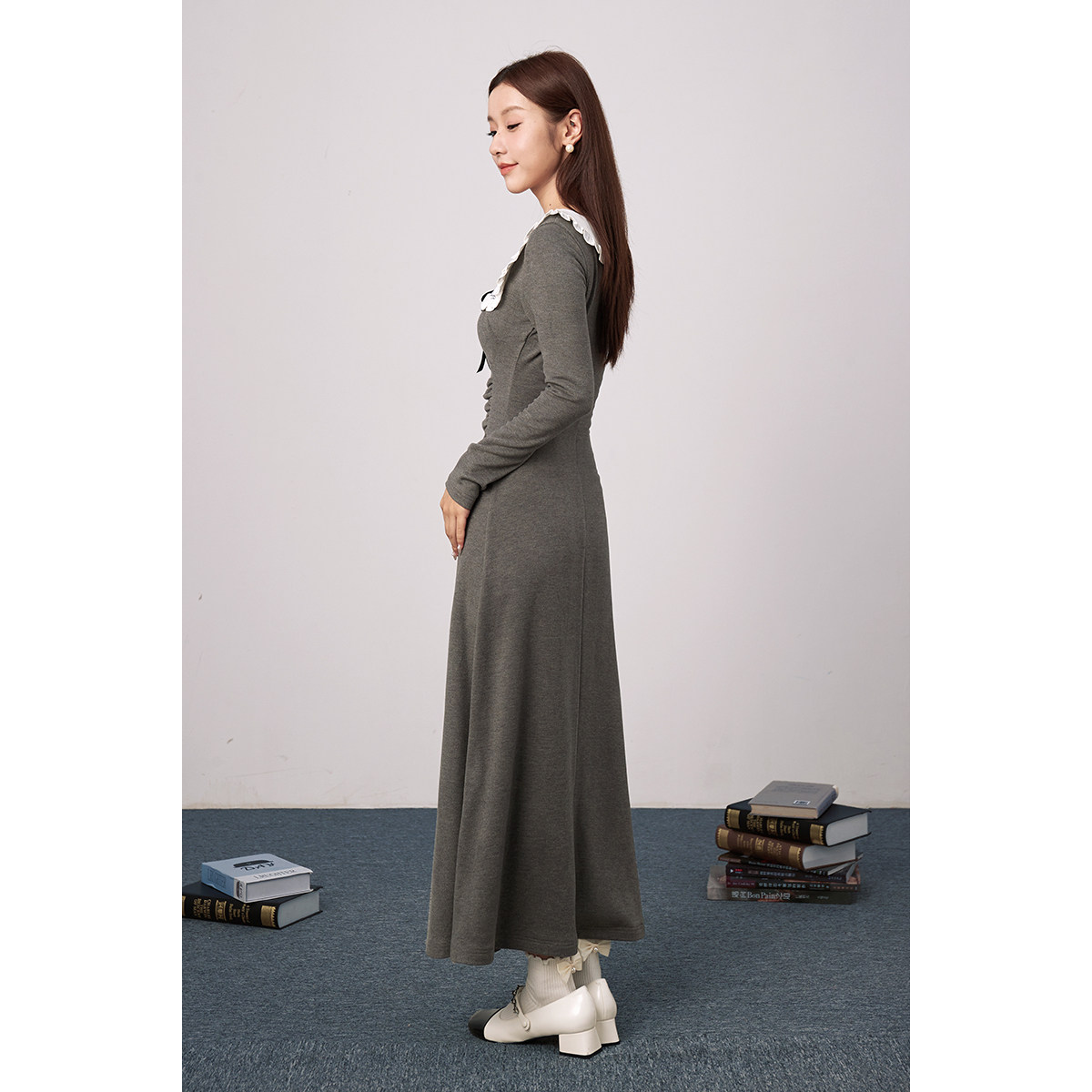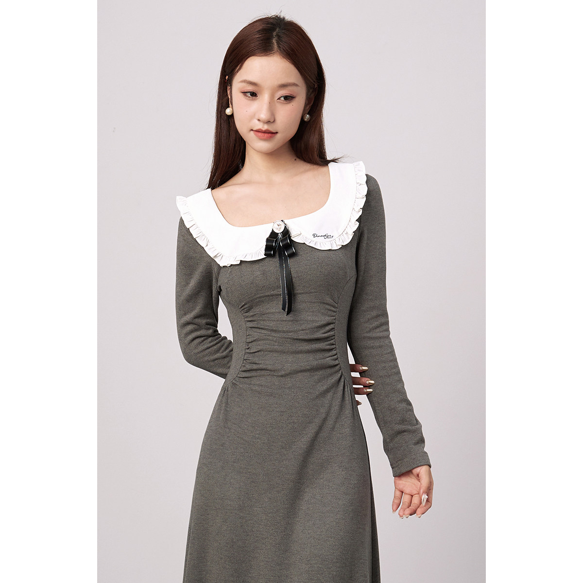 DINOSAUR AUNT恐龙阿姨 灰色娃娃领针织方领长袖收腰显瘦连衣裙
