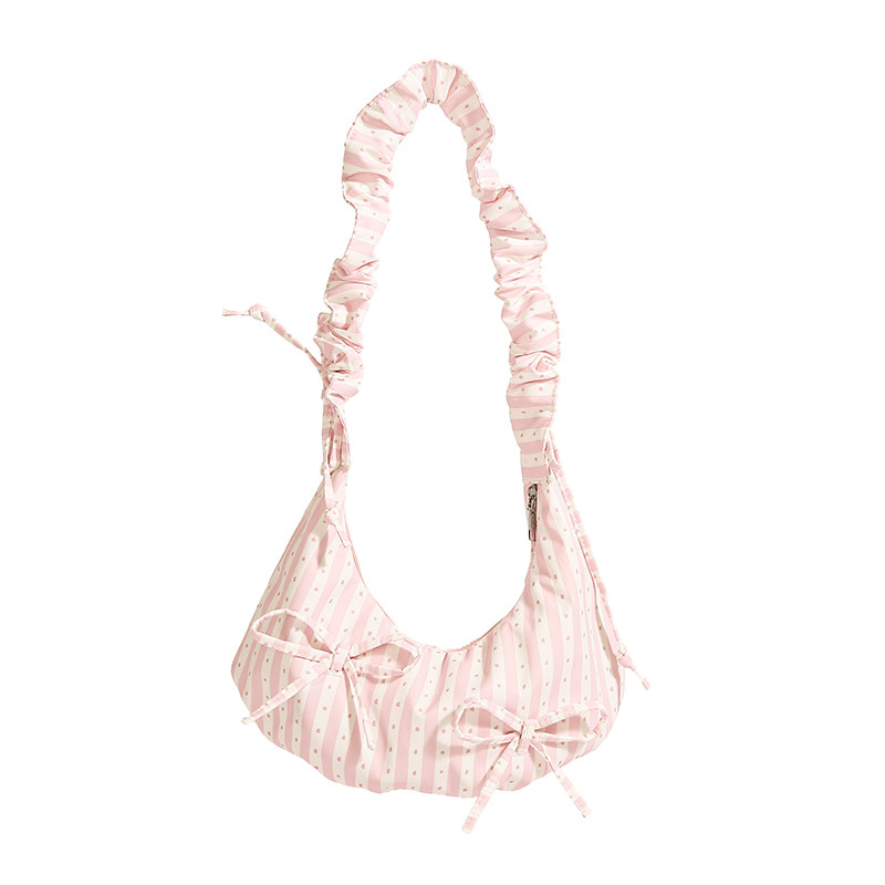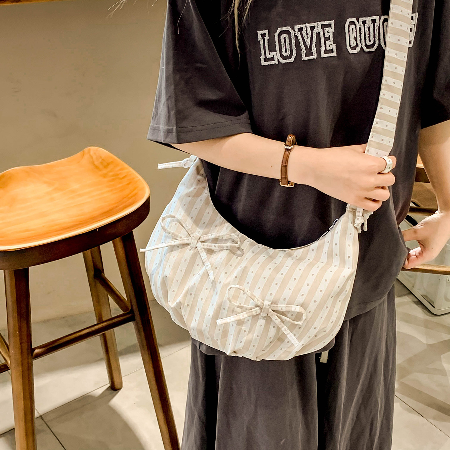 夏天大容量高级感通勤斜挎包女2025新款粉色条纹帆布蝴蝶结饺子包