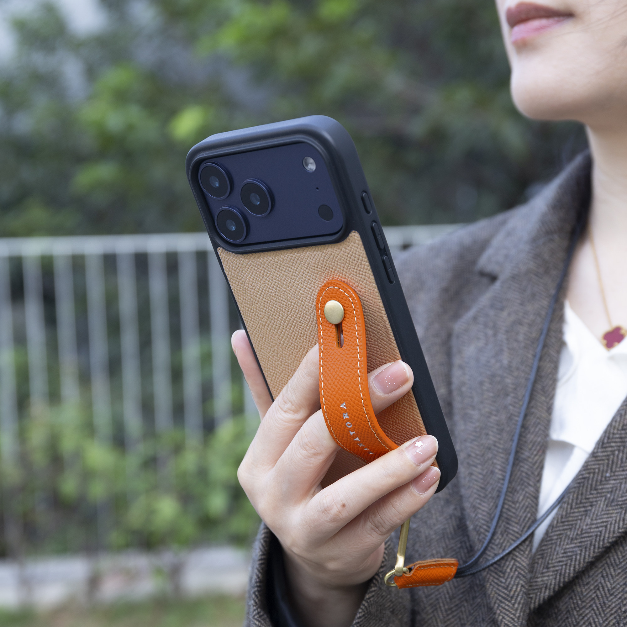 HANATORA花虎适用苹果17/16/15promax手机壳新款支架腕带可挂绳真皮14/13全包防摔手机套高级感高端男女款Air